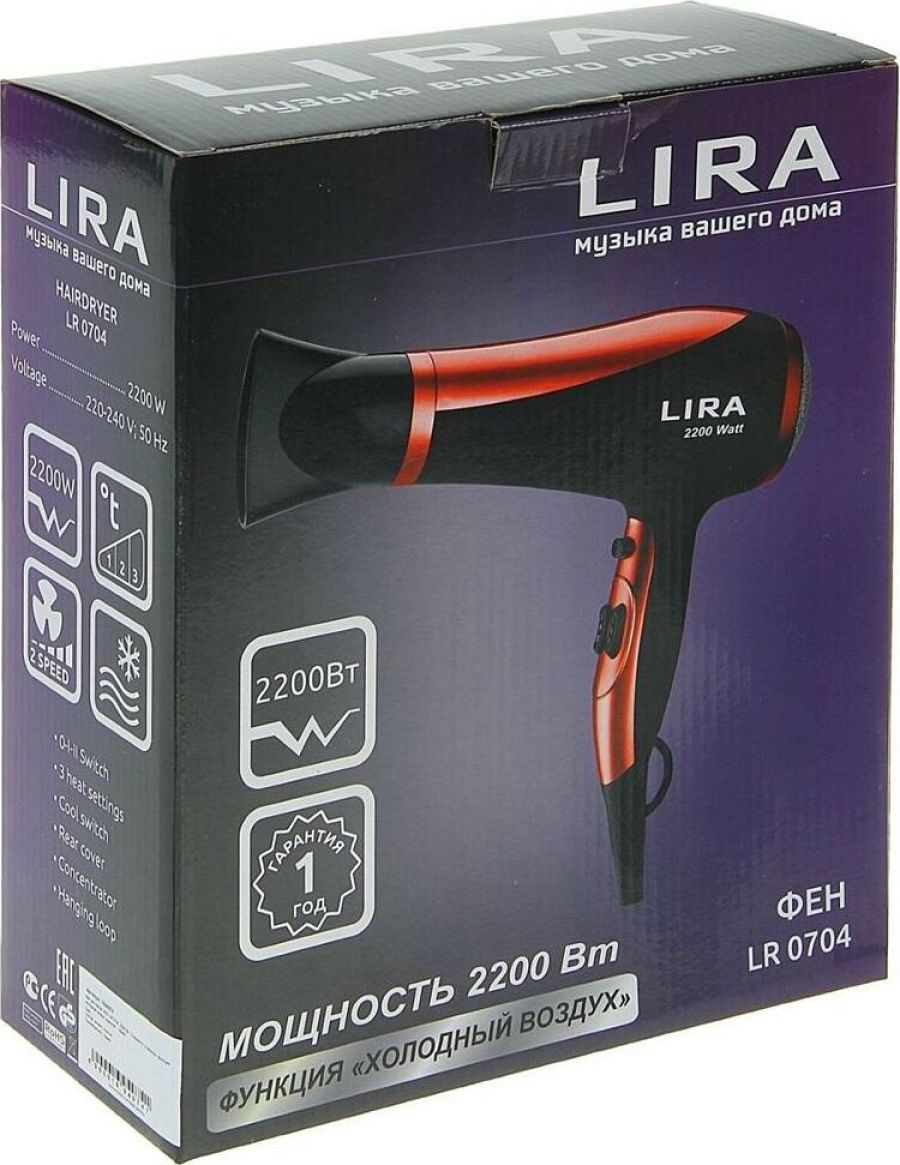 Мощность 2200 Вт, Напряжение сети 220 В, 2 скорости потока воздуха, 3 температурных режима, Функция "Холодный воздух", Защитная решетка, Насадка-концентратор.