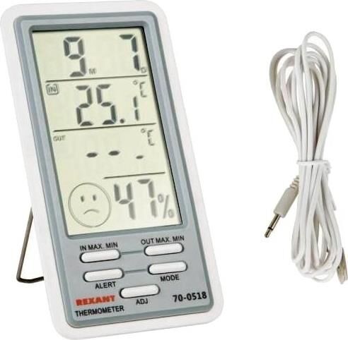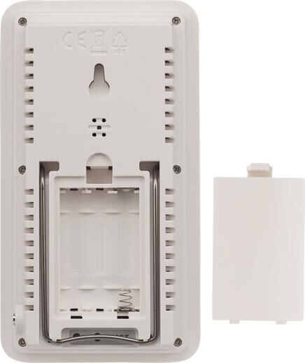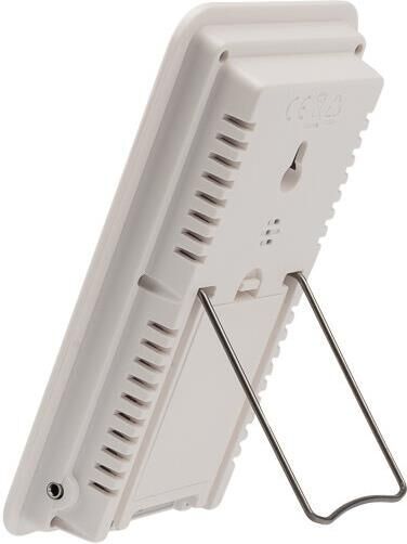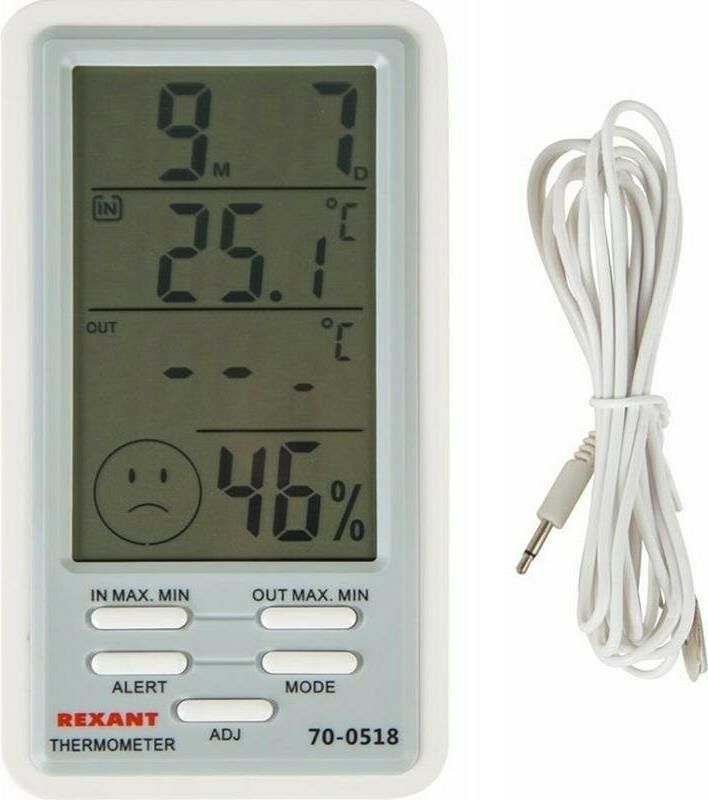 Характеристики: Размер: 145х80х24 мм Электропитание: батарейка типа AAA 1.5 V 1 шт. Одновременная демонстрация значений времени, температуры в помещении, наружной температуры, влажности в помещении. Единицы измерения температуры: °С Регистрация максимального и минимального значений температуры Диапазон рабочих температур метеостанции: –10.+50 °С Диапазон рабочих температур проводного внешнего датчика: –50.+90 °С Автоматическая регистрация максимальных и минимальных значений внутренней и наружной температуры с отображением значения времени (мигает на ЖК дисплее). Автоматическое обнуление максимального значения (MAX) в 8: 00 часов Автоматический обнуление минимального значения (MIN) в 20: 00 часов Индикация степени метеокомфорта в помещении. Диапазон показаний влажности в помещении: 20-90 %