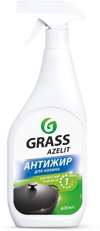 Бытовая химия Grass (ГраСС) Чистящее средство для кухни Azelit казан 600 мл. Средство Азелит АНТИЖИР КАЗАН для удаления жира, нагара и копоти с казанов, со сковородок, кухонных плит, коптильных камер, фритюрниц, грилей, духовых шкафов, микроволновых печей и др. Содержит активные чистящие вещества, которые помогают максимально эффективно справиться с застарелыми загрязнениями.Нанести на очищаемую поверхность, оставить не более чем на 30 секунд, в зависимости от загрязнения можно увеличить время экспозиции до 2 минут.