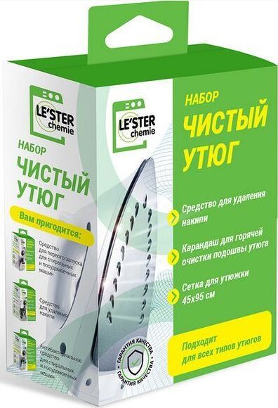 Набор с состав которого входит самое необходимое для сохранения чистоты и свежести утюга, а именно: 1) Карандаш для горячей очистки подошвы утюга 2) Средство для удаления накипи 3) Сетка для утюжки