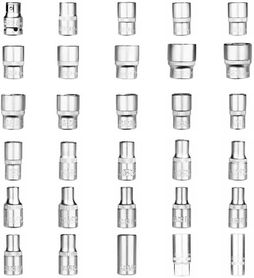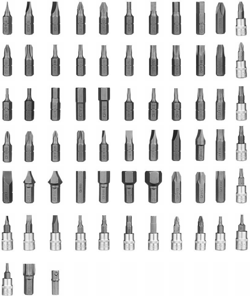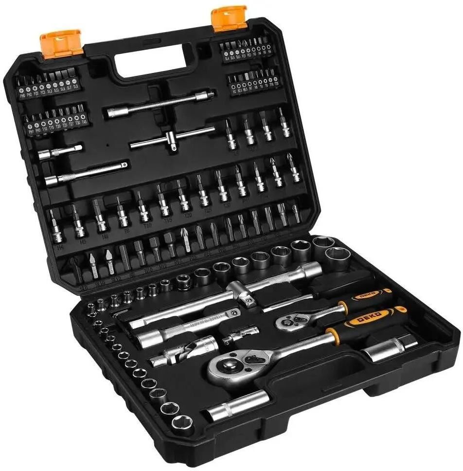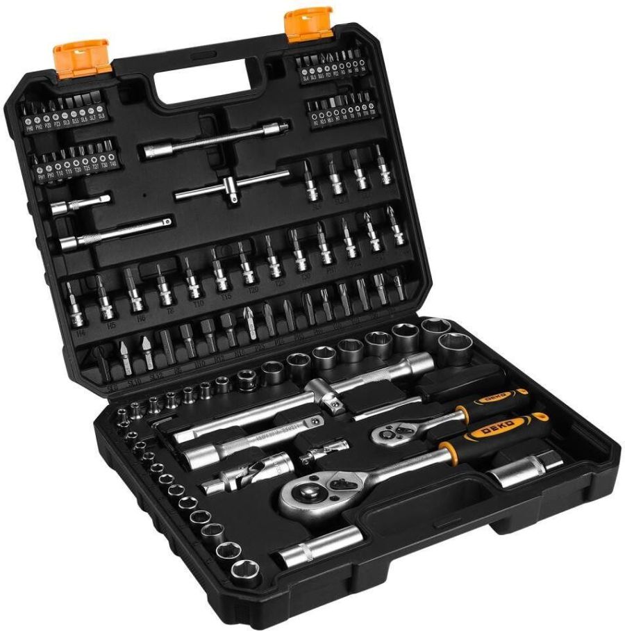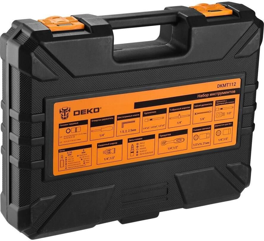 Набор инструментов для авто в кейсе DEKO DKMT112 предназначен для обслуживания автомобилей, а также подойдет для проведения ремонта бытовых конструкций, садовой техники дома и на даче. Все инструменты набора выполнены из стали, что обеспечивает их долгий срок службы. В комплект набора входит: Торцевые головки 1/4": 4, 4.5, 5, 5.5, 6, 7, 8, 9, 10 ,11, 12, 13, 14 мм; Е4, Е5, Е6, Е7, Е8 - 18 шт Торцевые головки 1/2": 14, 15, 16, 17, 18, 19, 21, 24 мм - 8 шт Отвертка-держатель - 1 шт Шестигранные ключи: 1.5, 2, 2.5 мм - 3 шт Удлинители: 1/4"х2", 1/4"х4", 1/2"х5" - 3 шт Т-образный вороток 1/4" - 1 шт Гибкий удлинитель 1/4" - 1 шт Удлинитель с адаптером для головок 1/2" - 1 шт Биты 6.35 мм: TT: 10, 20; PZ: 0, 1, 2, 3; PH: 0, 1, 2, 3; SL: 3, 4, 5, 5.5, 6, 6.5, 7, 8; H:2, 2.5, 3, 4, 5, 5.5, 6, 7, 8; T:8, 9, 10, 15, 20, 25, 27, 30, 40; AD - 36 шт Биты 8 мм: T: 40, 45, 50, 55; H:8, 10, 12, 14; SL:8, 10, 12; PH: 3, 4; PZ:3, 4 - 16 шт Карданный шарнир: 1/4", 1/2" - 2 шт Биты-головки: PH:1, 2; PZ: 1, 2; H: 3, 4, 5, 6; SL: