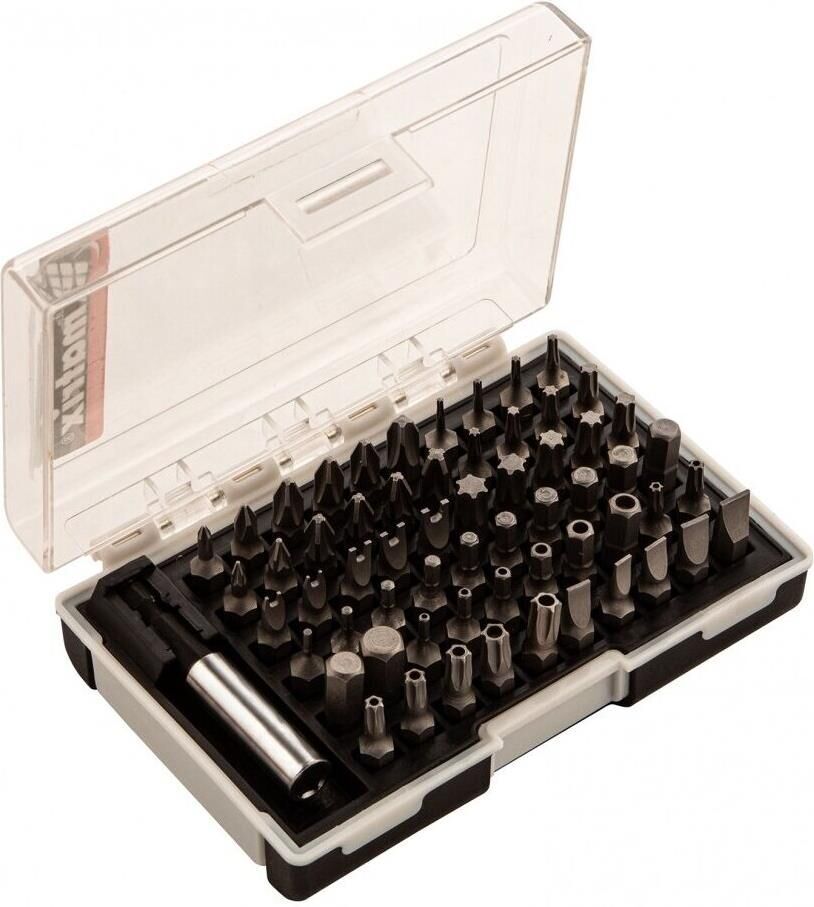 Набор Matrix 11387 состоит из 61 предмета: 60 бит из стали CrV и магнитного держателя. Включает сразу несколько типоразмеров бит длиной 25 мм: SL калибров 3, 4, 5, 5,5, 6, 7, 8, PZ и PH № 0-3, HEX № 1,5, 1,5, 2, 2,5, 3, 3,5, 4, 4,5, 5, 5,5, 6, 7, 8, TORX 5, 6, 8, 9, 10, 15, 20, 27, 30, 35, 40, Spanner калибров 4, 6, 8, 10, TORX Tamper 10, 15, 20, 25, 27, 30, 35, HS № 2, 2,5, 3, 4, 5, 6. Насадки используются в качестве оснастки на шуруповертах и реверсивных отвертках, применяются для монтажа и демонтажа резьбовых крепежей.ПреимуществаПрочность и износостойкость — биты выполнены из высококачественной хромованадиевой стали.Встроенный магнит — битодержатель надежно фиксирует насадки, а также облегчает их замену.Удобное хранение и транспортировка — набор поставляется в пластиковом кейсе.Продуманная упаковка — на кейсе имеется выдвижной европодвес для размещения на стенде.
