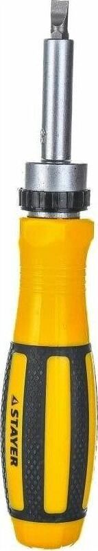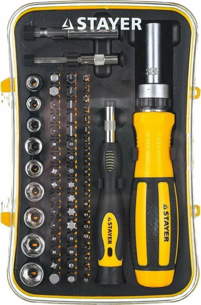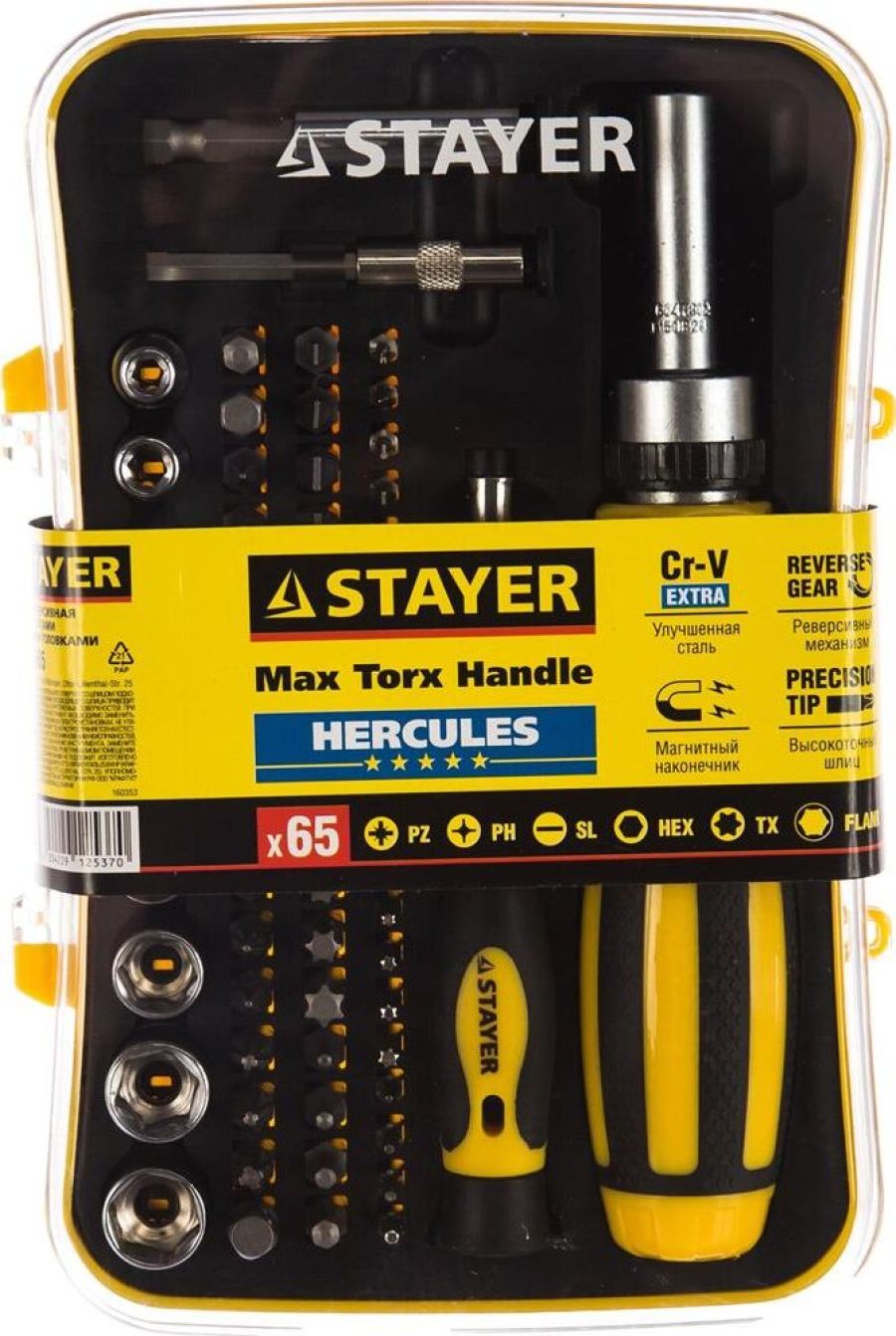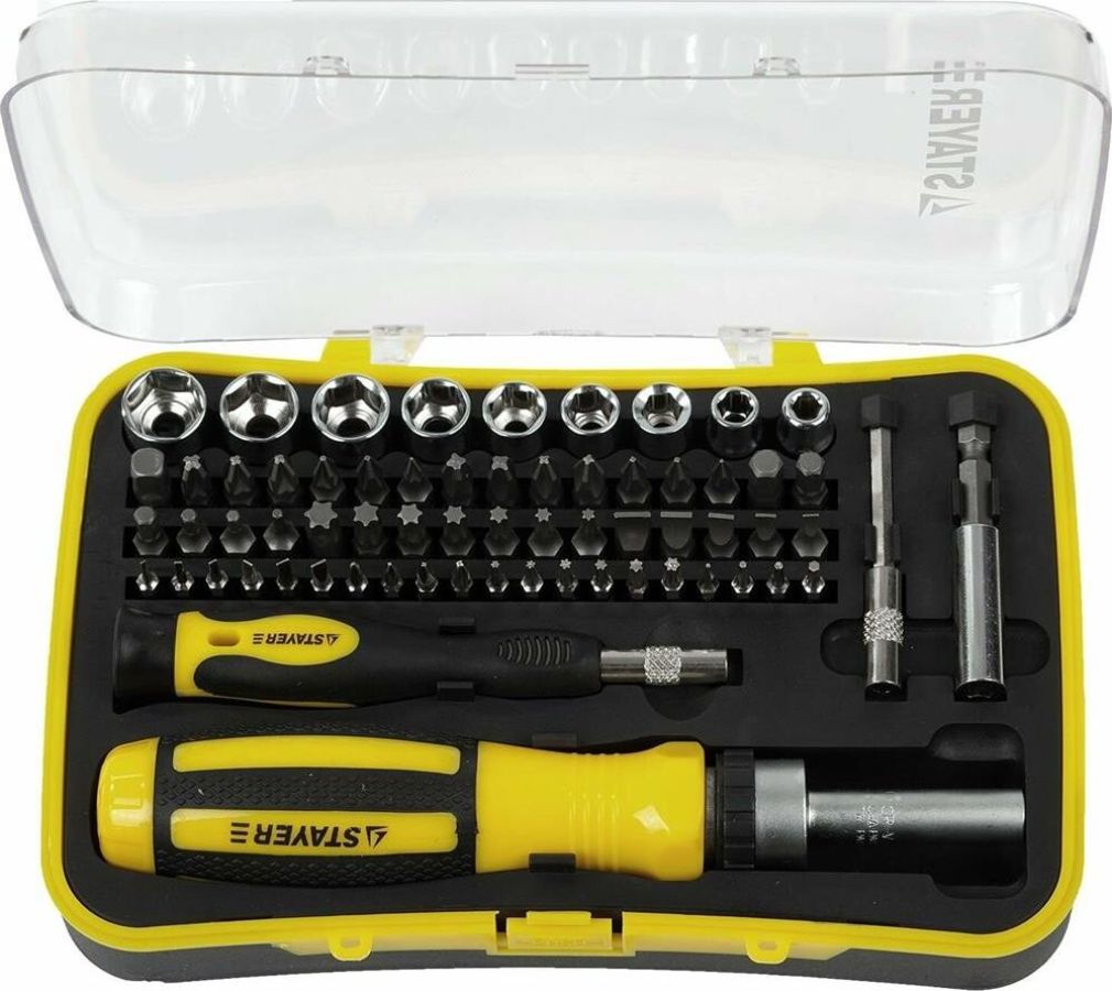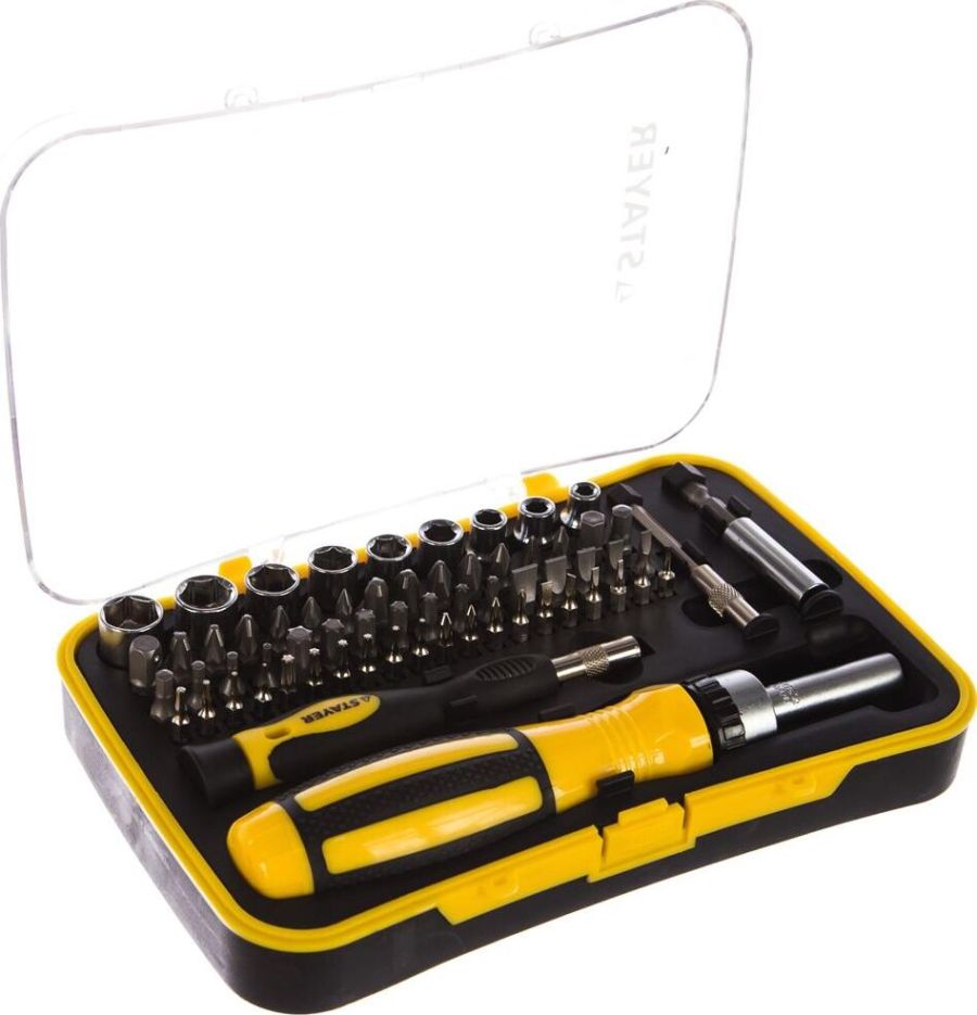 Набор насадок с реверсивной отверткой 65 предметов STAYER MASTER 25310-H65 - комплект для осуществления работ с крепежными элементами. Обеспечивает комфорт при закручивании и точность. Технические характеристики набора STAYER 25310-H65 Тип наконечника набор Количество насадок в наборе, шт 60 Материал рукояти двухкомпонентная Трещоточный механизм есть Диэлектрическое покрытие нет Намагниченный наконечник да Ударная нет Для точных работ да Форма ручки Прямая Материал насадок CrV Тип шлица PH; SL; PZ; TORX; HEX; торцевые головки, квадрат Комплектация * Отвертка для точных работ с магнитным фиксатором; Биты 1/4" (31 шт.); Адаптер с магнитным фиксатором 60 мм; Торцевые головки 1/4" (9 шт.); Переходник HEX 1/4" - SQ 1/4"; Биты для точных работ (20 шт.); Адаптер для точных работ с магнитным фиксатором 60 мм; Пластиковый бокс.