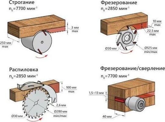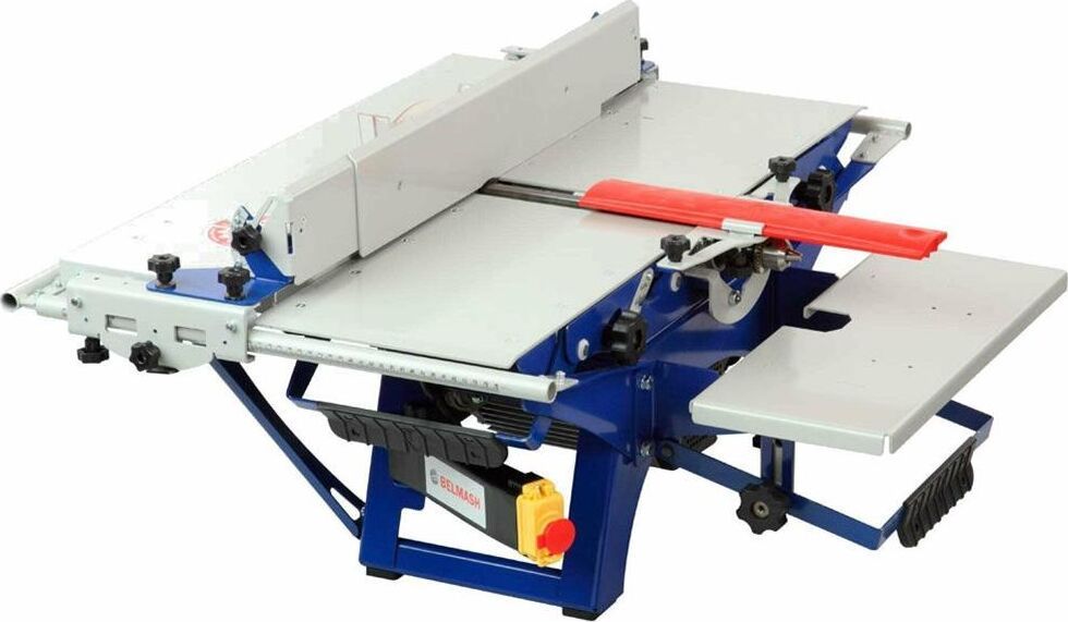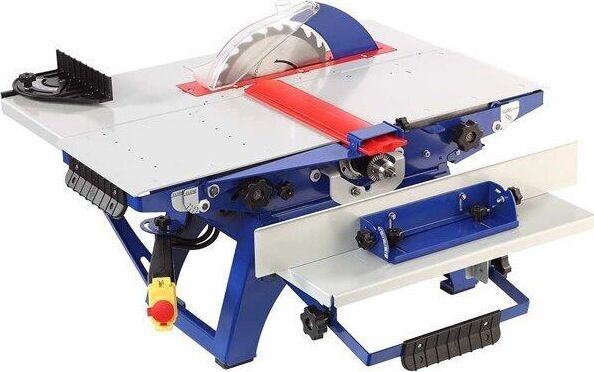 Станок деревообрабатывающий. Мощность 2000 Вт Напряжение питающей сети 230 В Частота тока 50 Гц Тип электродвигателя Асинхронный Диаметр пильного диска 250 мм Частота вращения пильного диска 2850 об/мин Диапазон углов распиловки вдоль волокон с помощью параллельного упора 0-45 ° Посадочный диаметр пильного диска 30 мм Диапазон углов распиловки по торцу -45...+45 ° Максимальная ширина распиливаемого материала, при использовании параллельного упора 260 мм Максимальная толщина распиливаемого материала 85 мм Размер пильного стола (Д х Ш) 732 х 474 мм Частота вращения ножевого вала 7700 об/мин Частота вращения дисковой фрезы 2850 об/мин Диаметр дисковой фрезы 125 мм Максимальная толщина дисковой фрезы 10 мм Посадочный диаметр дисковой фрезы 30 мм Максимальная высота фрезерования дисковой фрезой 22,5 мм Частота вращения шпинделя 7700 об/мин. Диаметр хвостовика зажимаемого инструмента 13 мм Максимальная глубина строгания 3 мм Размер фрезерного столика (Д х Ш) 470 х 190 мм