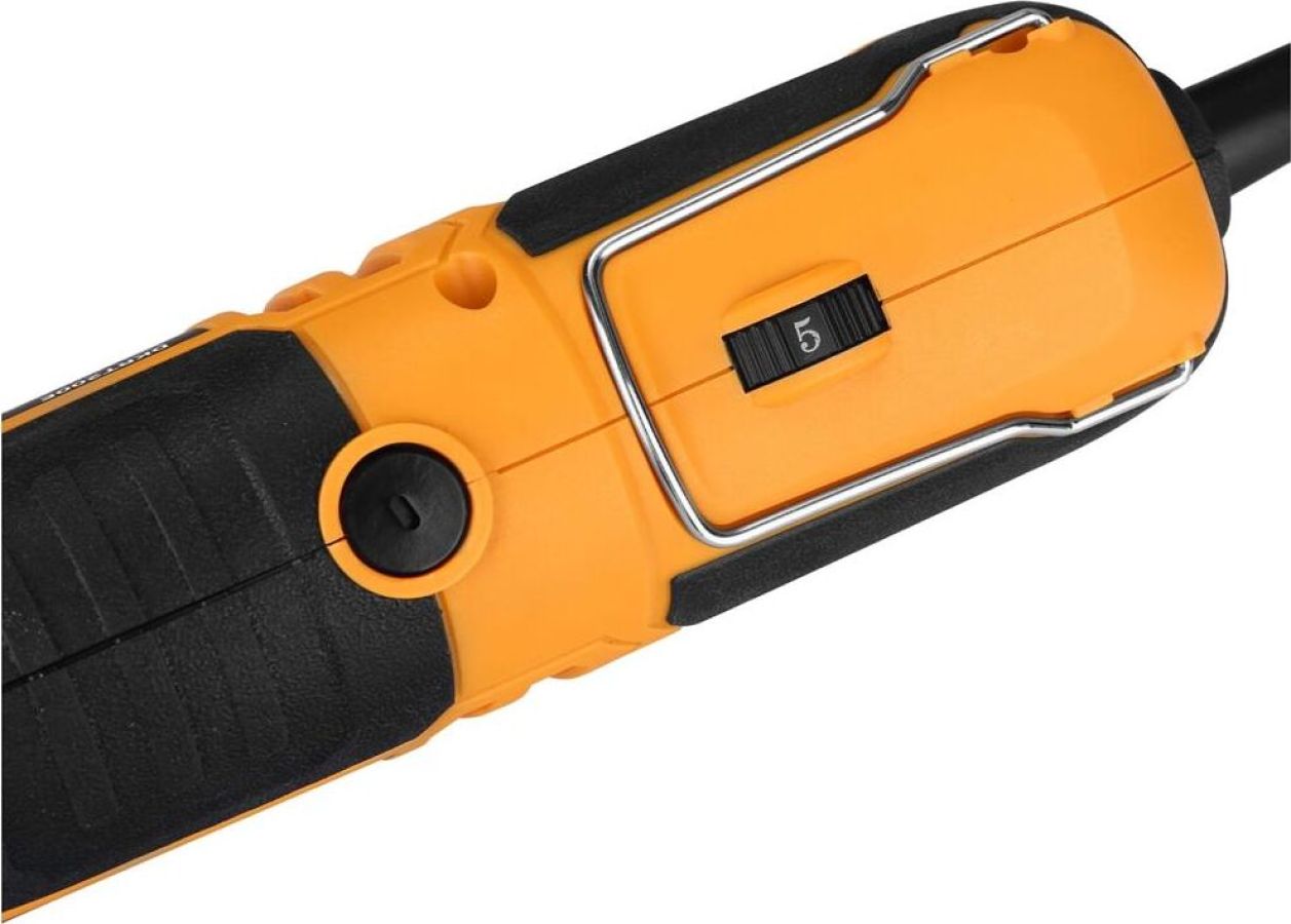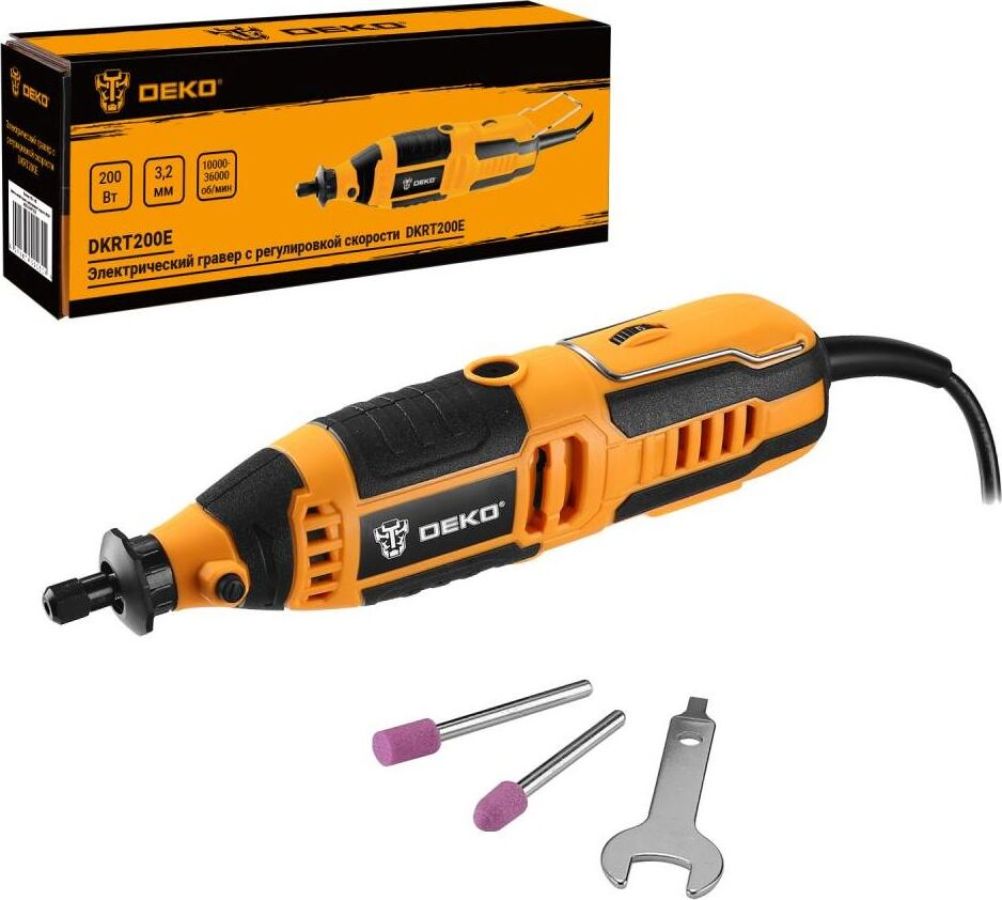 Тип двигателя щеточный. Мощность 200 Вт. Размер цанги 3.2 мм. Частота вращения шпинделя 10000-36000 об/мин. Электронная регулировка оборотов есть. Гибкий вал в комплекте нет. Упаковка коробка. Длина кабеля 1.5 м. Габариты без упаковки 290-100-60 мм.