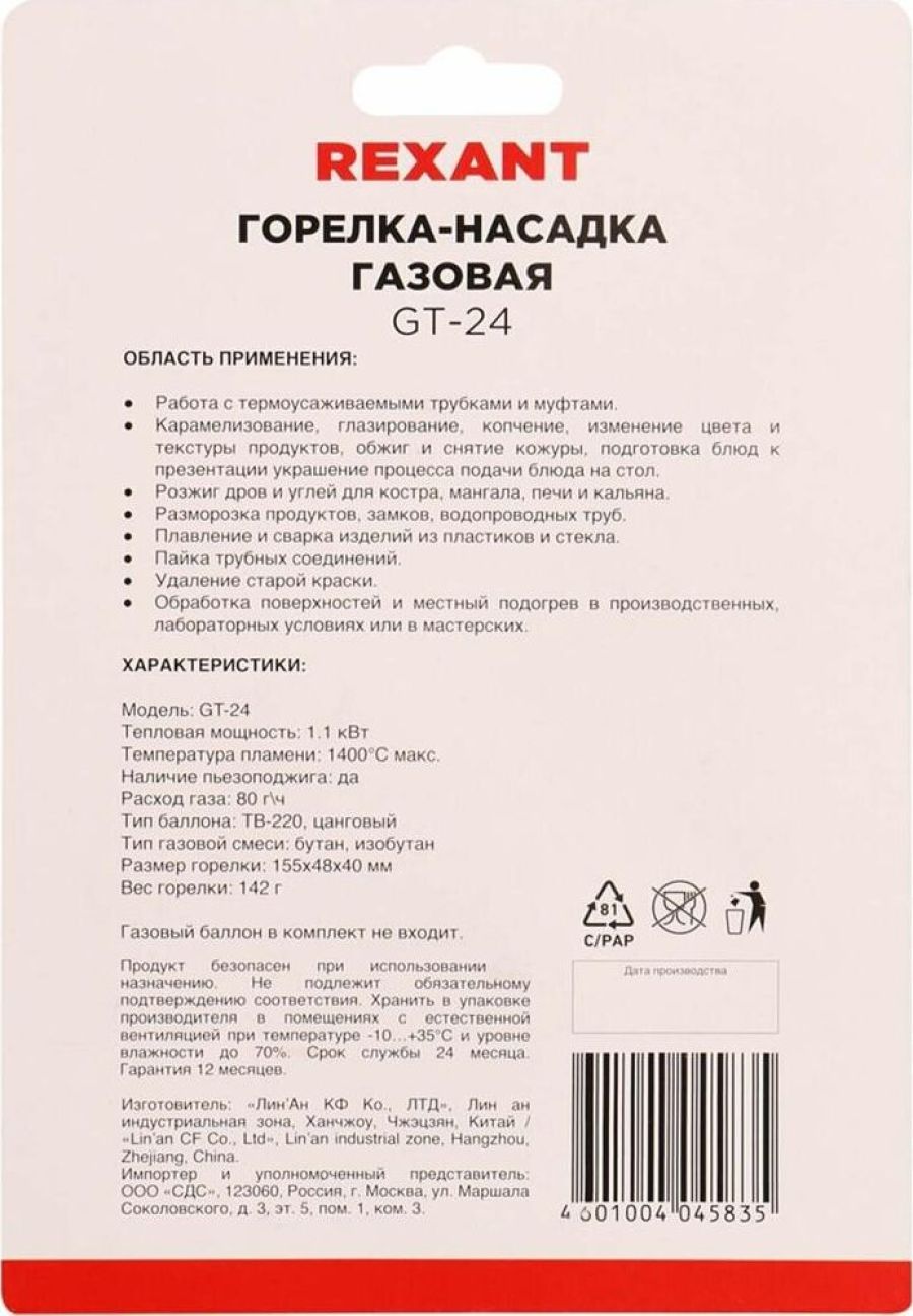 Газовая горелка-насадка, мощность: 1,1кВт 0,946 ккал , температура пламени: 1400 С (макс.), расход газа: 80 гр/ч, тип поджига: встроенный пьезо, материал: медь + нержавеющая сталь + алюминий + сплав цинка + пластик, сфера применения: от плавления и сварки до копчения продуктов, тип газового баллона: ТВ-220 (цанговый).