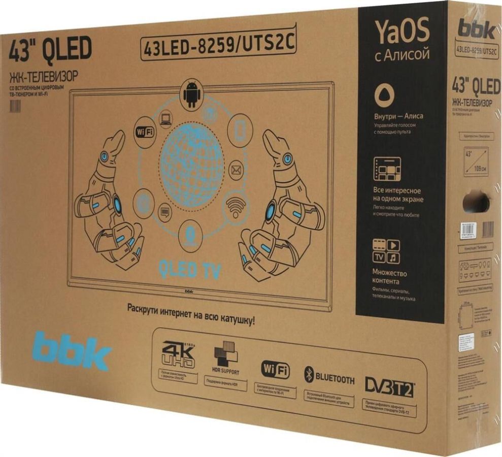 Диагональ (дюйм): 43. Диагональ (см): 109. Разрешение экрана: 3840x2160 (Ultra HD). SMART. Операционная система: Android Open Source Project (AOSP). Версия операционной системы: Android 11. Тип SMART платформы: Яндекс ТВ. DVB-T2. DVB-S2. DVB-C. Wi-Fi. LAN. Наличие Bluetooth. Ci слот (шт): 1. USB-порт (шт): 2. HDMI (шт): 3. Оперативная память (Гб): 1,5. Встроенная память (Гб): 8