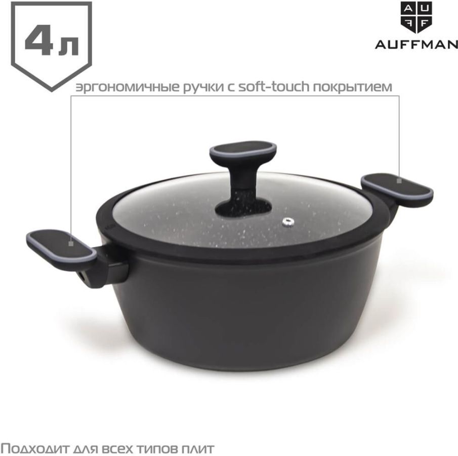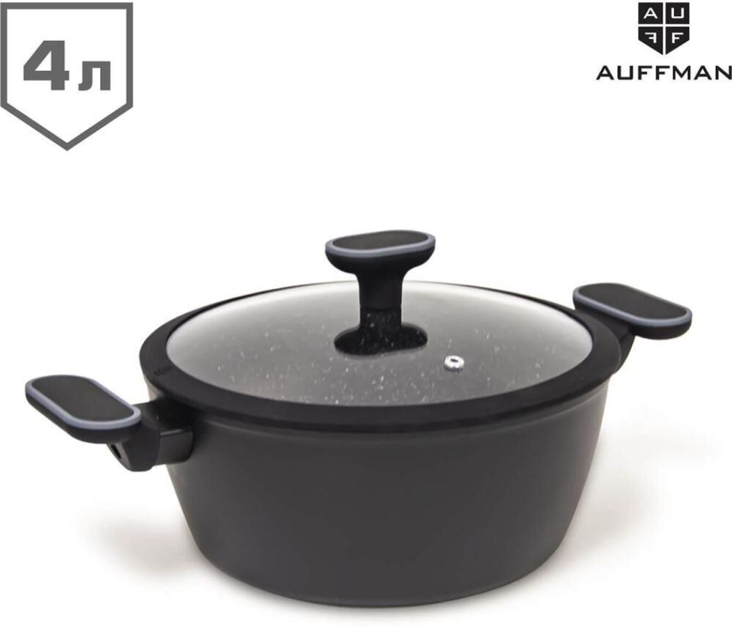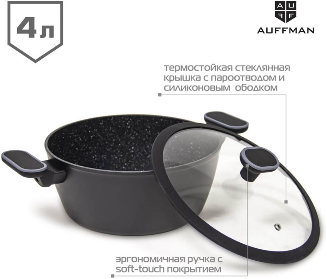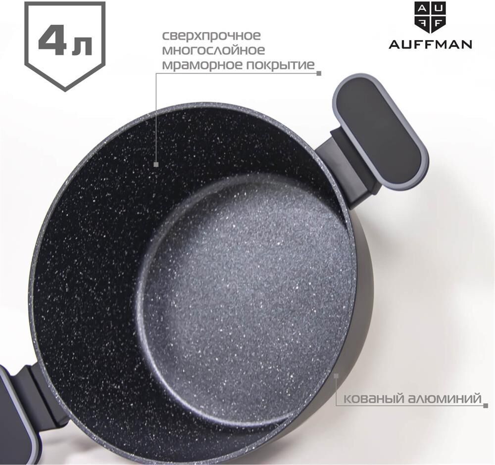 Кастрюля. Кованый алюминий Толщина края 4мм, толщина изделия 3мм Индукционное дно Ручка с софт-тач покрытием Внутри антипригарное мраморное покрытие с белыми точками, 2 слоя Снаружи высокотемпературное покрытие Подходит для всех видов плит, включая индукц