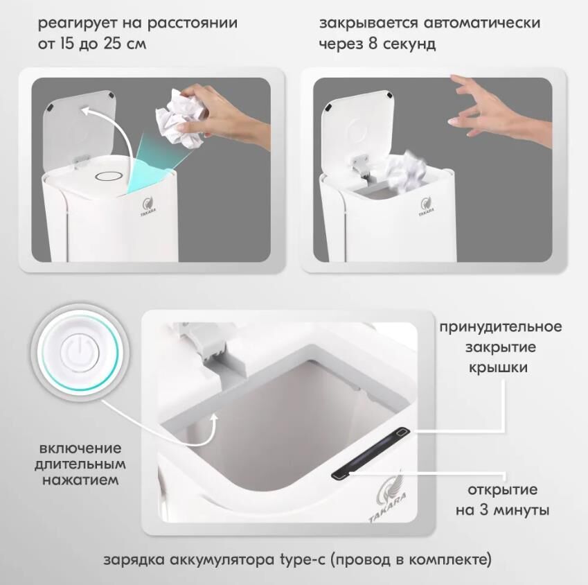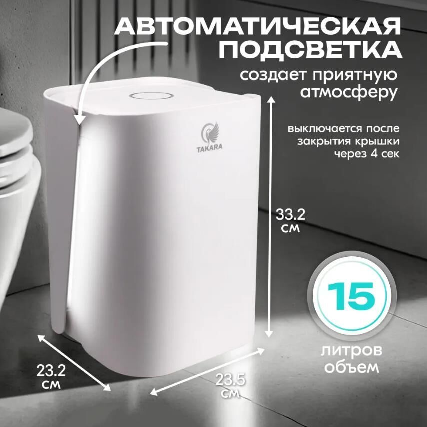 Способ открытия бака Сенсор Материал корпуса Пластик Единиц в одном товаре 1 Размещение мусорки напольное Форма мусорного бака Прямоугольная Размеры Объем, л 15 Высота, см 33.4 Длина, см 23.7 Ширина, см 23.5 Датчик реагирует на приближение предмета на расстоянии 15-25 см. Крышка остается открытой, пока рука или предмет находятся в зоне действия датчика, что особенно удобно при длительных процессах, таких как чистка овощей. Если предмет выходит из зоны действия датчика, крышка остается открытой еще 8 секунд, после чего автоматически и плавно закрывается.
