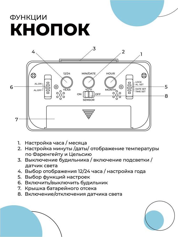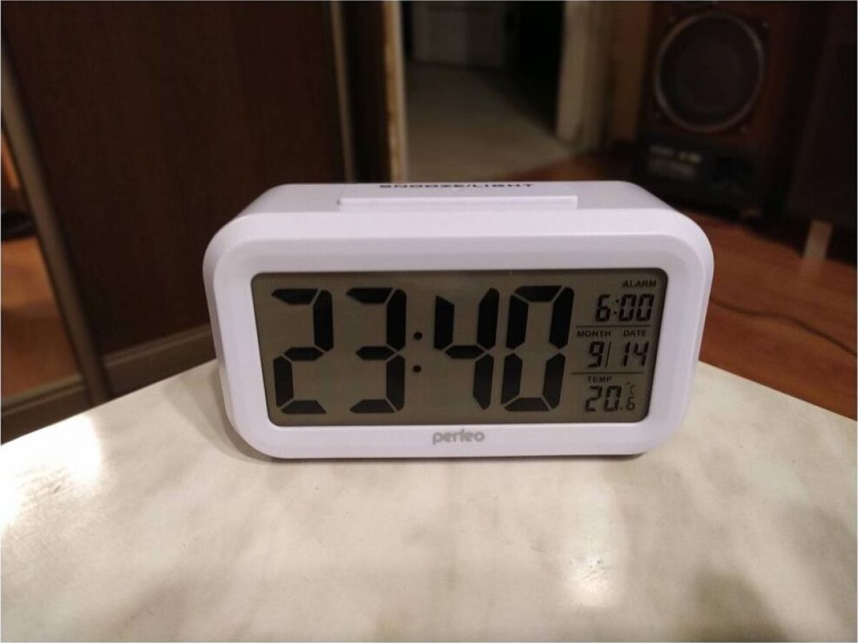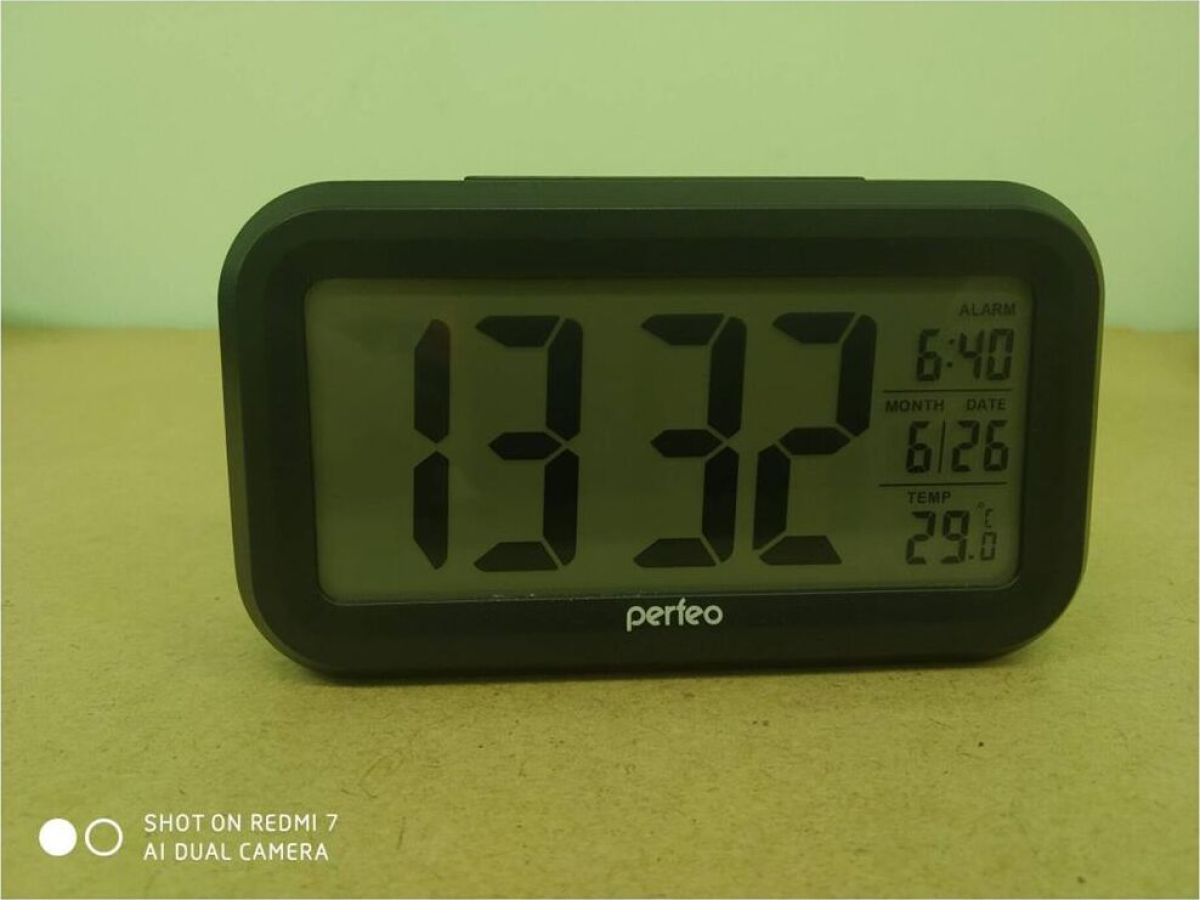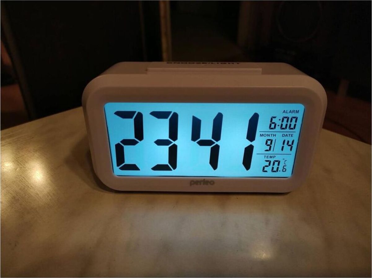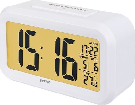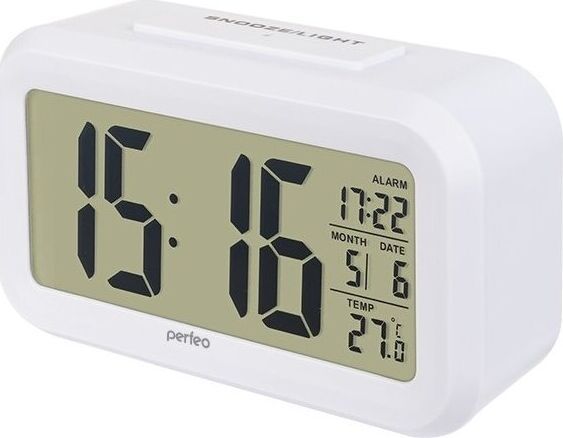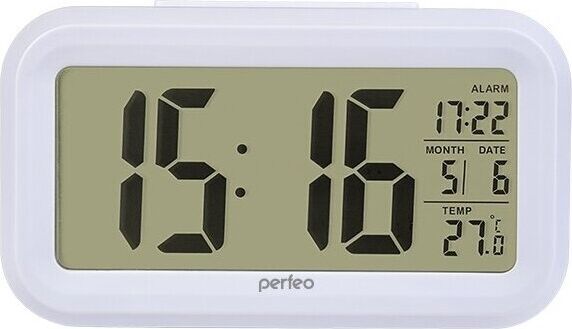 Часы-будильник, цифровой дисплей с одновременным отображением времени, даты и температуры, отображение времени: час, минута, 12/24 часа переключаемый, тображение температуры: °С/°F, будильник, подсветка дисплея, датчик света, питание: от батареек 3 х AAA (в комплекте)