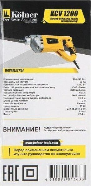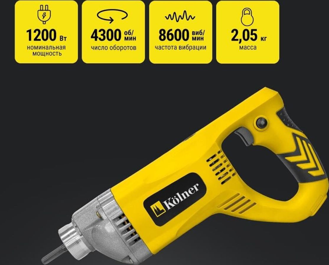 Номинальная мощность: 1200 Вт. Параметры питания: 220-240 В ~ 50 Гц. Число оборотов шпинделя на холостом ходу: 4300 об/мин. Частота вибрации: 8600 виб/мин. Посадка булавы вибратора: HEX 8. Тип резьбы булавы вибратора: М40, левый. Рекомендуемая длина булавы вибратора: 1,5-3 м. Длина шнура питания: 2 м. Габаритные размеры: 33х16х8 см. Масса: 2,05 кг.