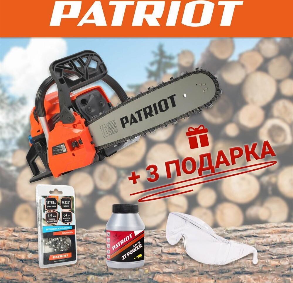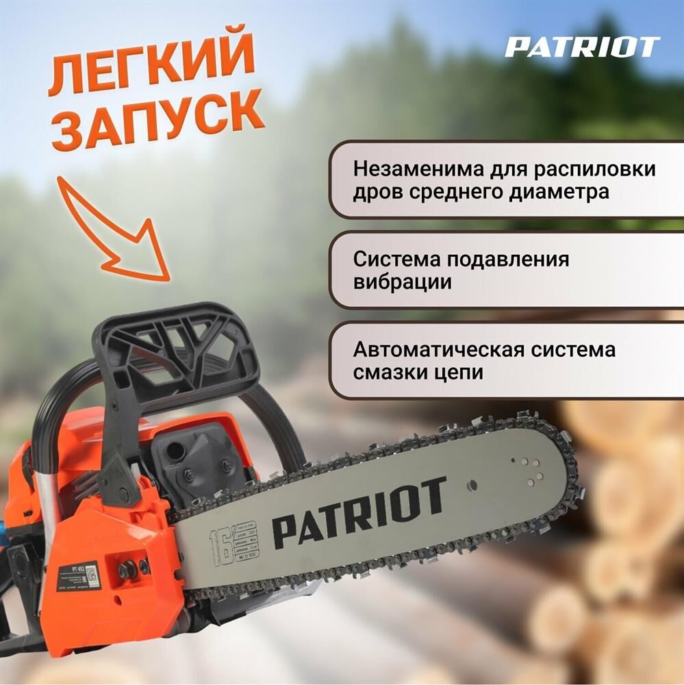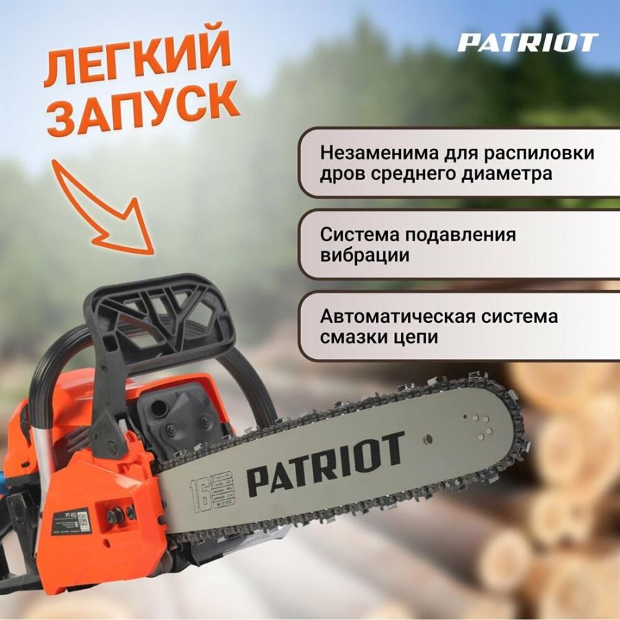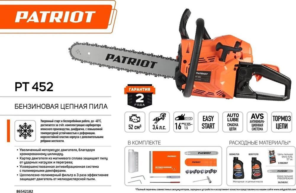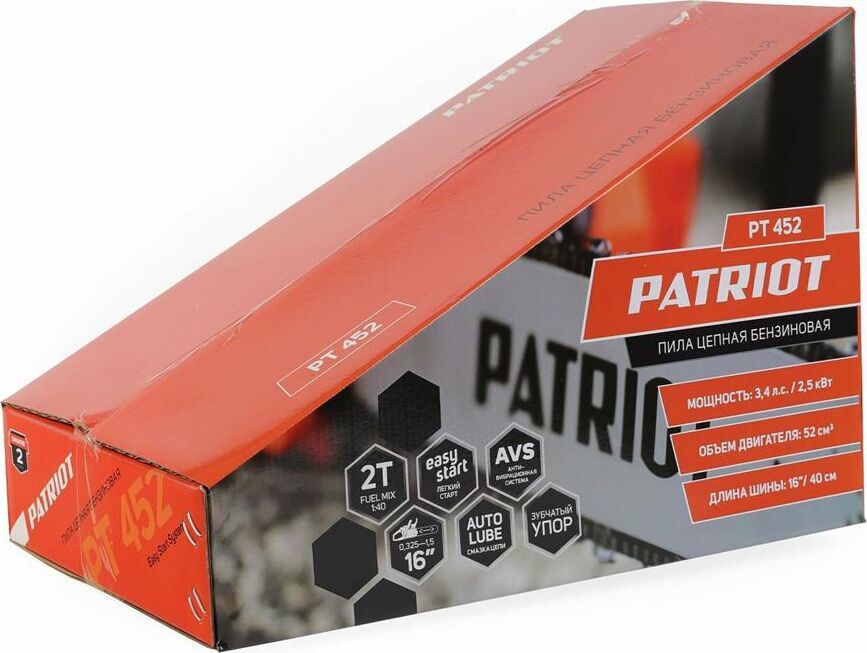 Длина шины, дюйм/см 16/40. Количество звеньев, шт 64. Шаг цепи, дюйм 0,325. Обороты холостого хода, об/мин 3100±200. Ширина паза, мм 1.5. Мощность двигателя, л.с. 3.4. Объем двигателя, см3- 52. Объем топливного бака, л 0,55. Тип двигателя 2-х тактный бензиновый. Тип топлива смесь 1: 40 (масло Patriot G-Motion + бензин АИ 92). Свеча зажигания L7T. Объем масляного бака, л 0.26. Антивибрационная система Да. Макс. обороты без нагрузки, об/мин 11500. Автоматическая смазка цепи Да. Легкий запуск (Easy Start) Да. Тормоз цепи Да. Прорезиненная рукоятка Да. Габариты упаковки, cм 26х29х41.