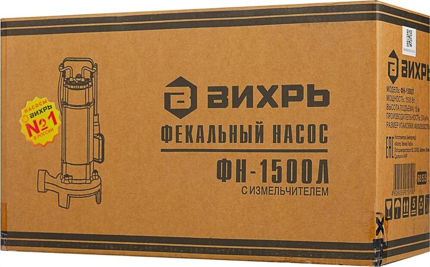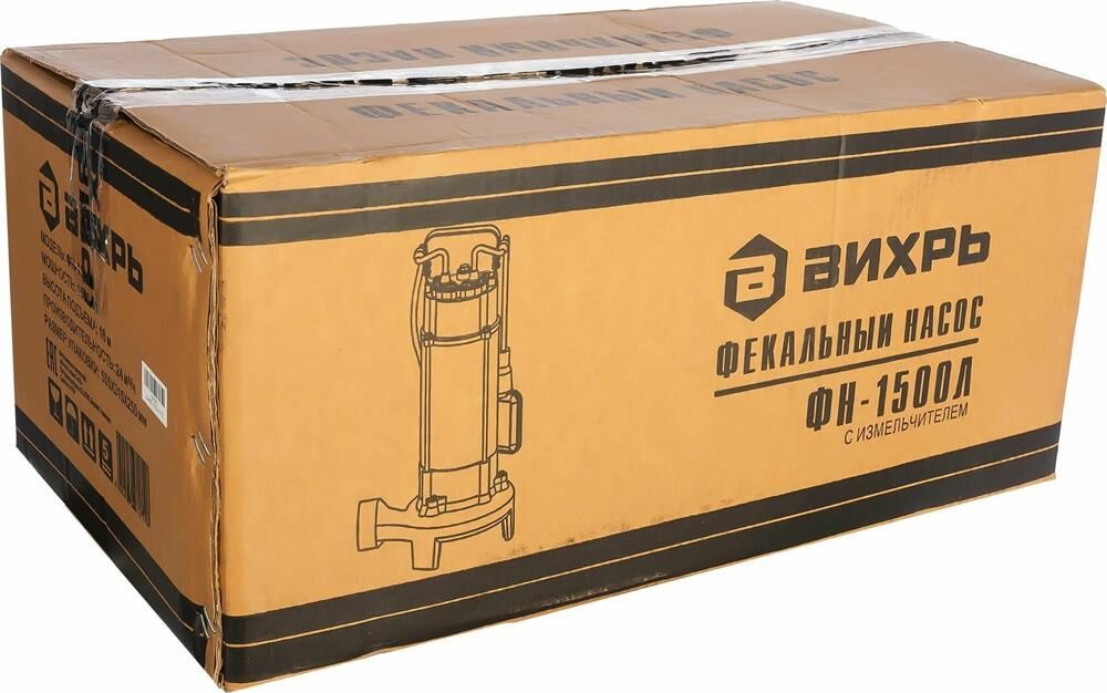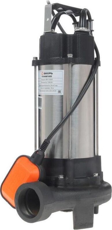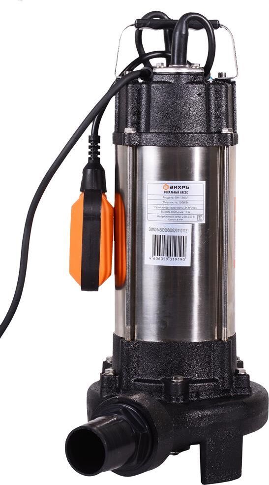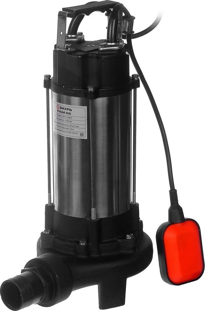 Фекальный насос ВИХРЬ ФН-1500Л. Мощность, Вт – 1500; Максимальная подача, л/мин – 400; Максимальный напор, м – 18; Нож (лезвие) – есть; Выходное отверстие, дюйм – 2;
