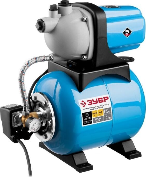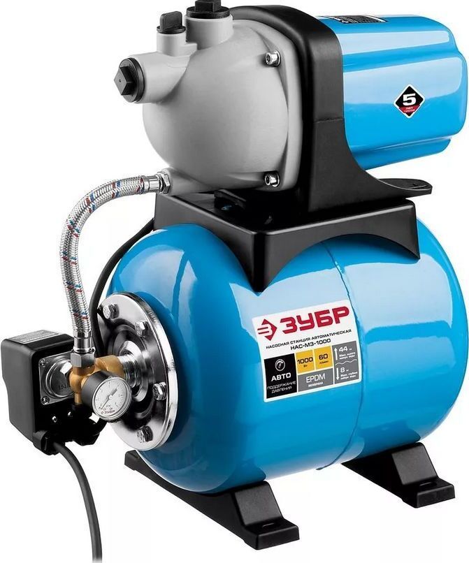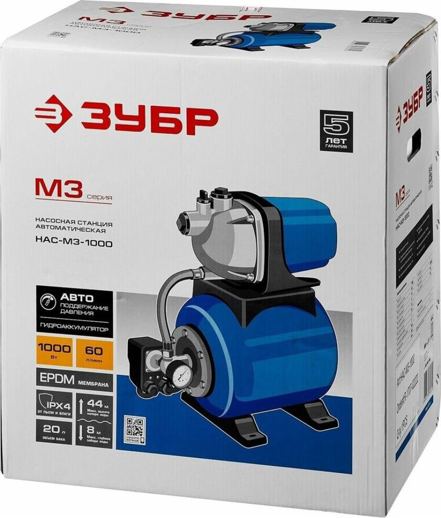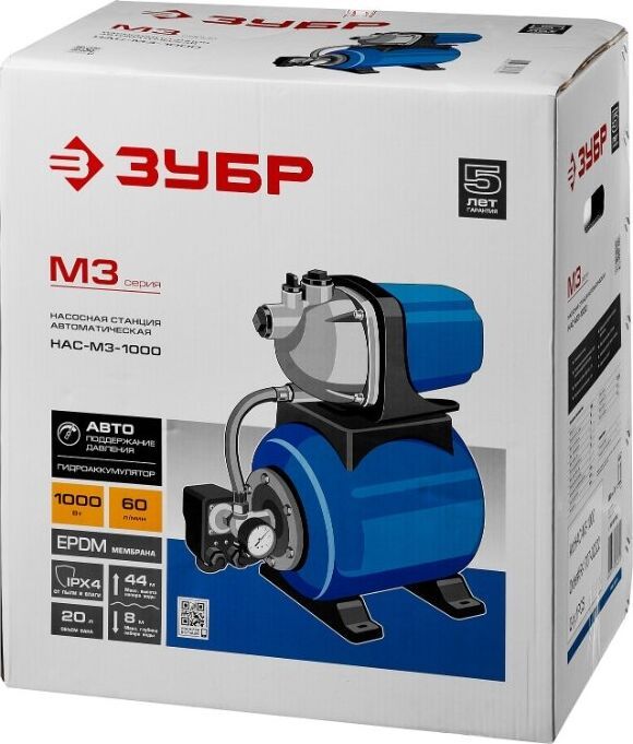 ЗУБР НАС-М3-1000 Станция насосная "МАСТЕР" М3 автоматическая Насосная станция ЗУБР МАСТЕР НАС-М3-1000 повышает давление в трубопроводных бытовых сетях. Применяется для организации водоснабжения, полива газонов и орошения садовых участков. Имеет пропускную способность 60 литров в минуту. Гидроаккумулятор (20 л) создаёт запас воды, сокращая количество включений и выключений системы, а термопредохранитель защищает от перегрева, исключая возможность поломки насоса. Мембрана гидроаккумулятора изготовлена из каучука EPDM, который не деформируется при низких температурах и выдерживает высокие нагрузки. Технические характеристики Зубр МАСТЕР НАС-М3-1000 Высота подъема, м 44 Мах температура жидкости, °С 35 Мощность, Вт 1000 Объем бака, л 20 Производительность, л/мин 60 Трубное соединение, дюйм внутренняя G1 Тип насосная станция Вид поверхностный Защита от сухого хода нет Ротор сухой Для повышения давления есть Эжектор нет Вес, кг 12,4