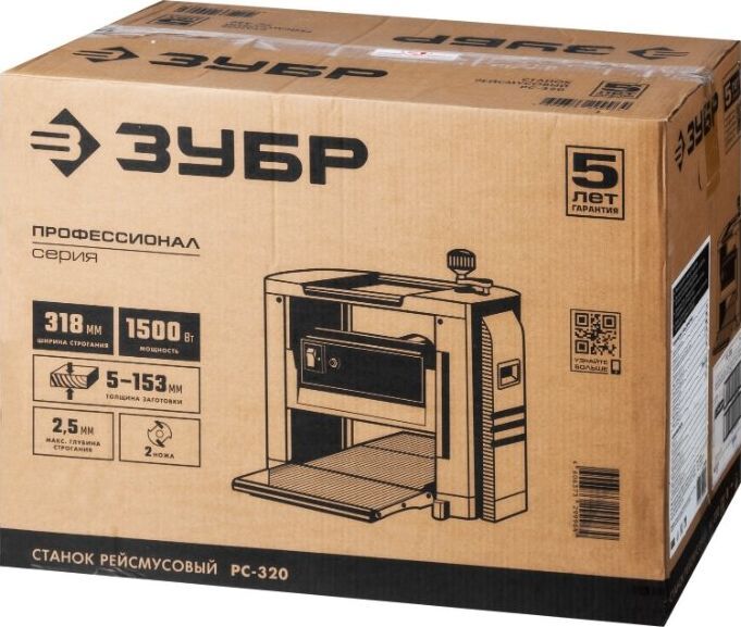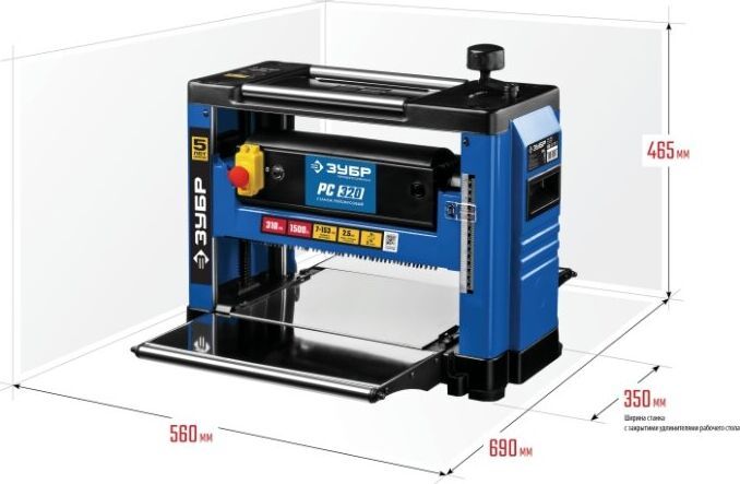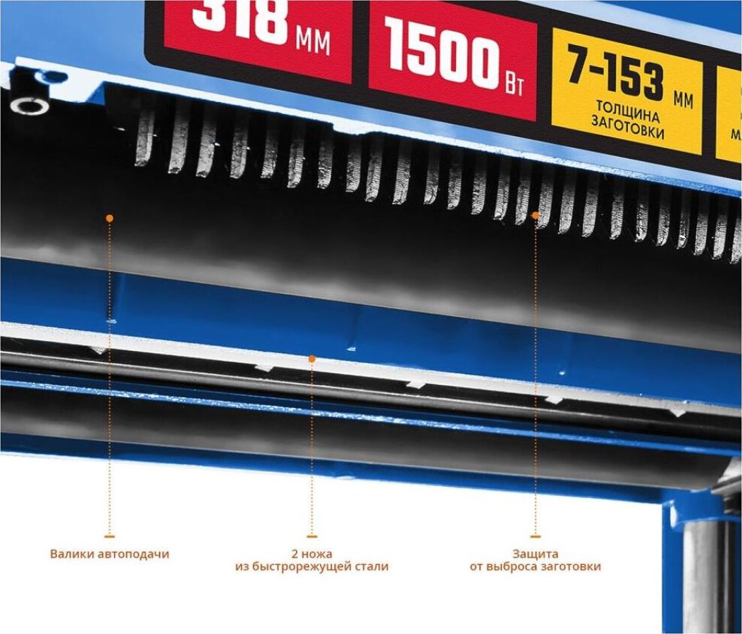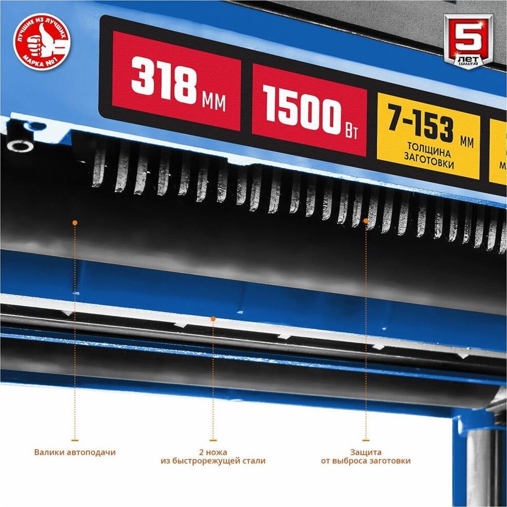 Глубина строгания, мм2.5. Диаметр подключения к пылесборнику, мм40 и 50. Кол-во ножей 2. Макс. толщина заготовки, мм153. Масса в упаковке, кг33.5. Масса изделия, кг32. Мин. Толщина заготовки, мм5. Мин. длина заготовки, мм130. Мощность, Вт1500. Напряжение питания, В/Гц220±10% /50. Размер ножа, мм318х18.2х3.2. Размеры рабочего стола, мм320х285. Размеры удлинителя стола, мм365х200. Скорость автоматической подачи, м/мин8. Тип станка Рейсмусовый. Частота вращения строгального вала, об/мин9000. Ширина строгания, мм318.