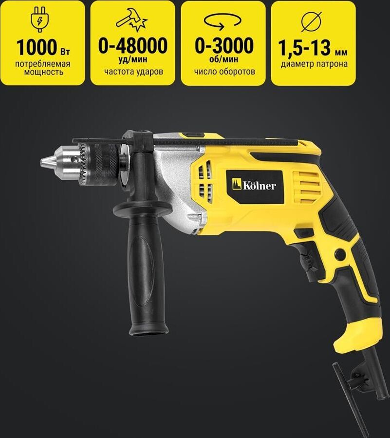 Срок службы: 1 г. , Гарантийный срок: 1 г. , Комплектация: дрель ударная, руководство по эксплуатации, глубиномер, ключ патрона, дополнительная рукоятка , Количество скоростей работы: 1 , Модификация (код производителя): кн1000вид , Размер(ДxШxВ): 320x90x215 мм