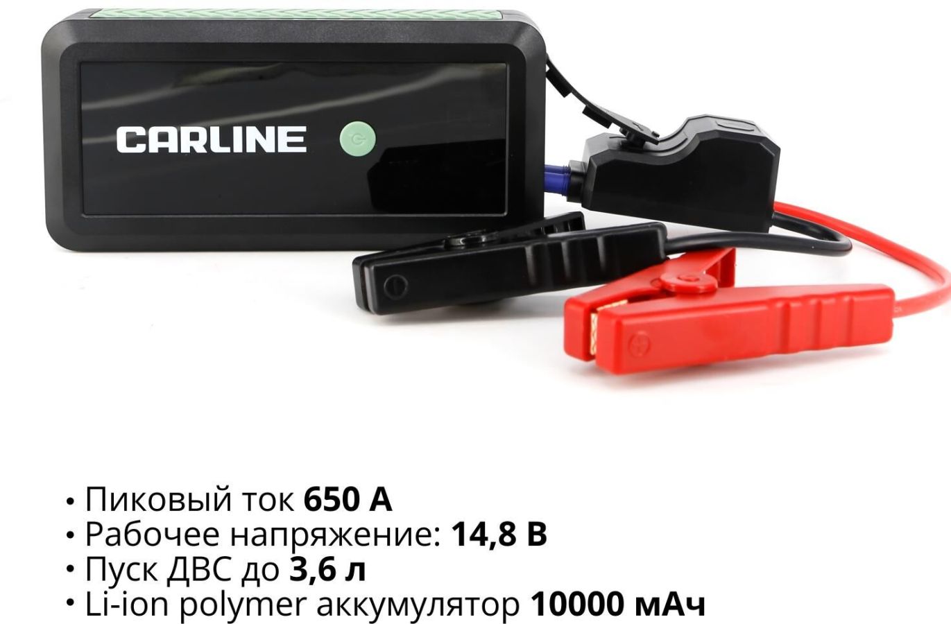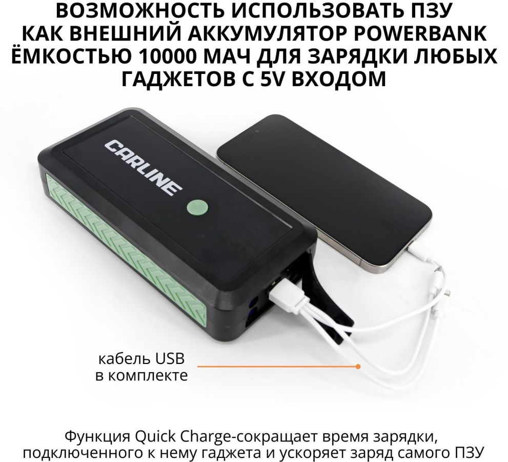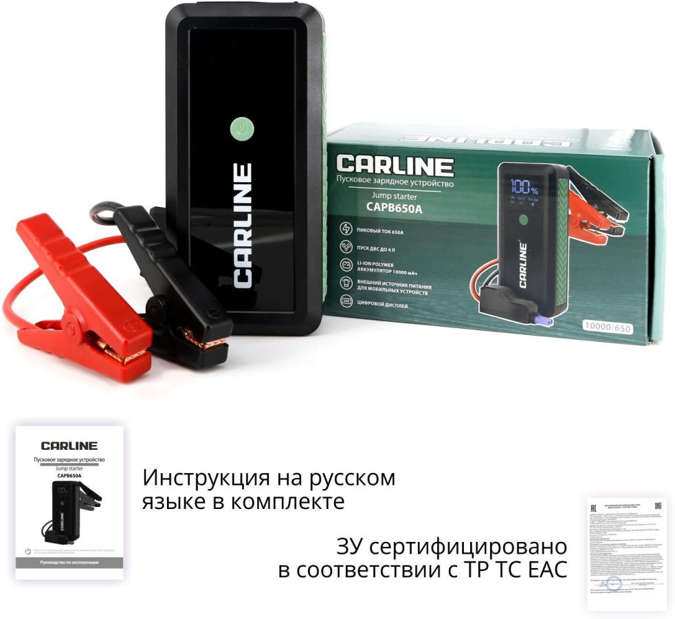 Усиленные медные зажимы «крокодил» с дополнительным защитным блоком с звуковой и световой индикацией сигнала ошибки • Многоуровневая защита от короткого замыкания и переполюсовки • Li-ion polimer аккумулятор класса +AAA • Цифровая индикация уровня заряда и типа подключения • Входной заряд через разъем Tipe-C с технологией Quick Charge (до 18W) • Функция PowerBank c 2-мя разъемами USB • Пусковое зарядное устройство • «Умные» стартовые провода с зажимами • Кабель USB • Инструкция по эксплуатации • Гарантийный талон • Входные параметры: Type-C (QС) - 5V/2A • Выходные параметры: USB 1 - 5V/2.1A USB 2 (QС)- 5V/3A, 9V/2A, 12V/1.5A • Ёмкость встроенного аккумулятора: 10000 мАч • Пиковый ток: 650А • Пусковое напряжение: 14,8 V • Тип встроенного аккумулятора: Li-ion polimer • Встроенный фонарик • Бренд: CARLINE • Страна производства: Китай • Материал: ABS пластик/металл