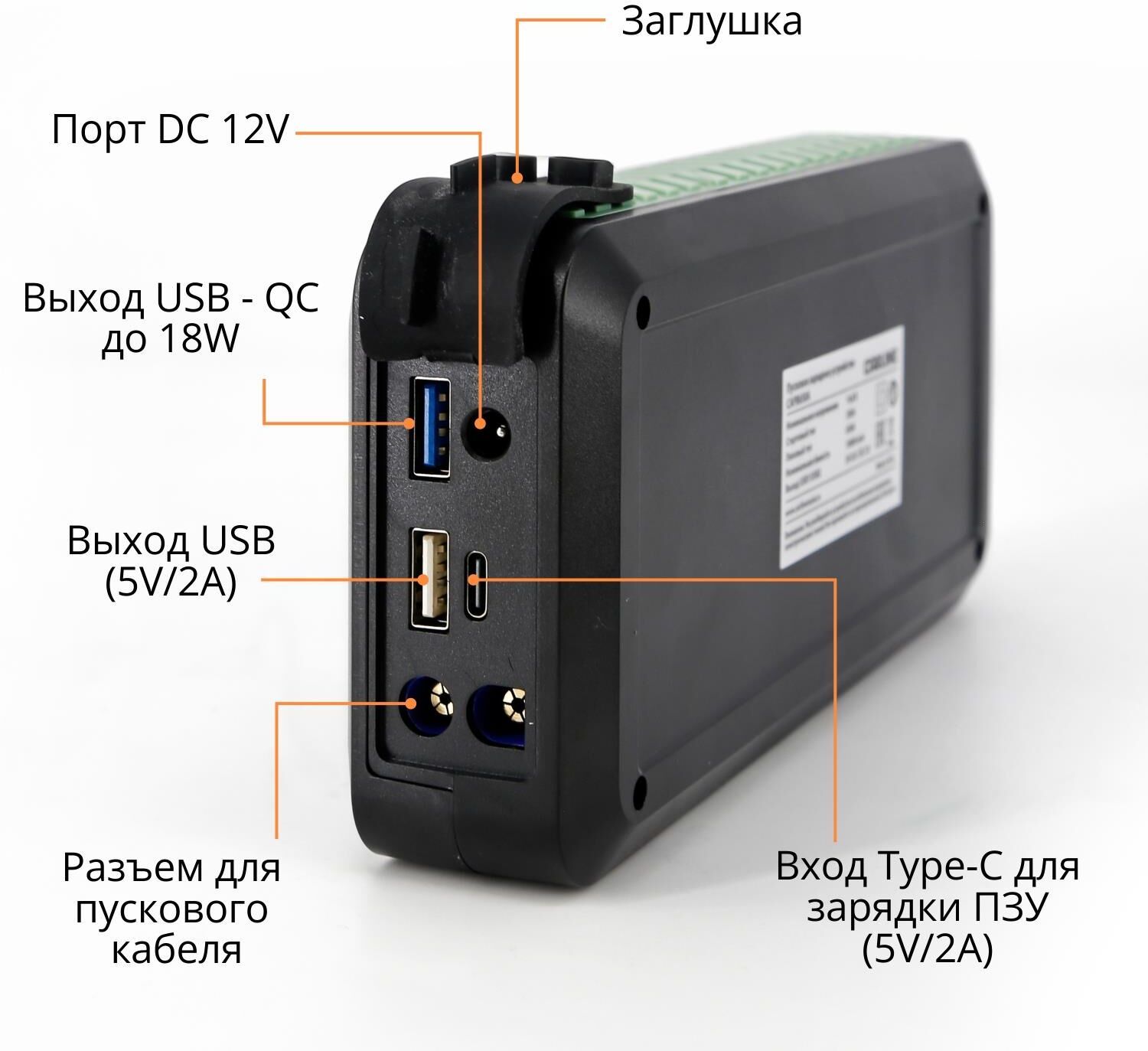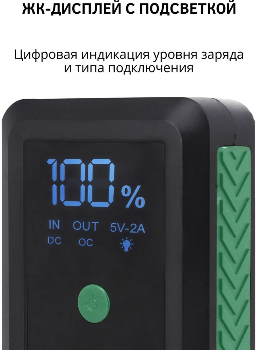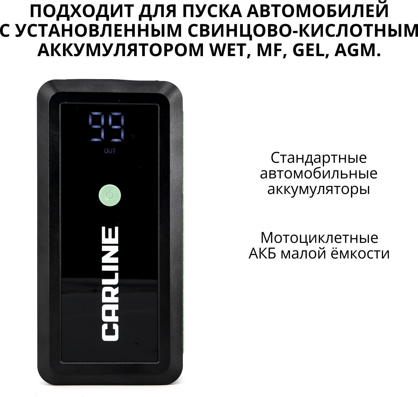 Усиленные медные зажимы «крокодил» с дополнительным защитным блоком с звуковой и световой индикацией сигнала ошибки • Многоуровневая защита от короткого замыкания и переполюсовки • Li-ion polimer аккумулятор класса +AAA • Цифровая индикация уровня заряда и типа подключения • Входной заряд через разъем Tipe-C с технологией Quick Charge (до 18W) • Функция PowerBank c 2-мя разъемами USB • Пусковое зарядное устройство • «Умные» стартовые провода с зажимами • Кабель USB • Инструкция по эксплуатации • Гарантийный талон • Входные параметры: Type-C (QС) - 5V/2A • Выходные параметры: USB 1 - 5V/2.1A USB 2 (QС)- 5V/3A, 9V/2A, 12V/1.5A • Ёмкость встроенного аккумулятора: 10000 мАч • Пиковый ток: 650А • Пусковое напряжение: 14,8 V • Тип встроенного аккумулятора: Li-ion polimer • Встроенный фонарик • Бренд: CARLINE • Страна производства: Китай • Материал: ABS пластик/металл