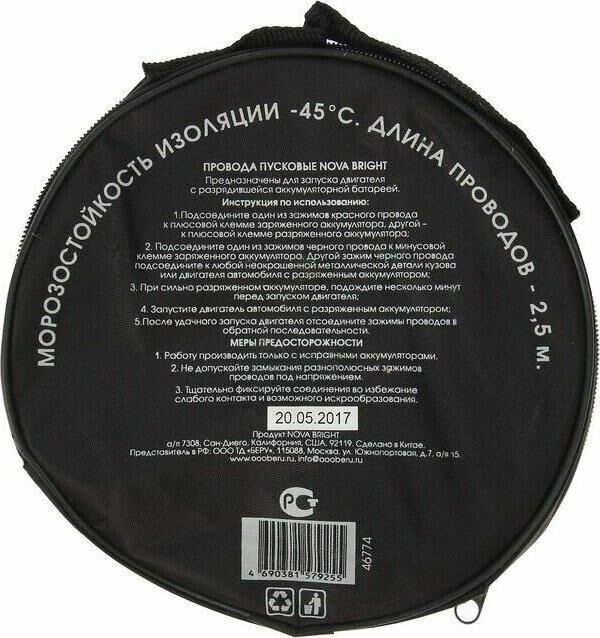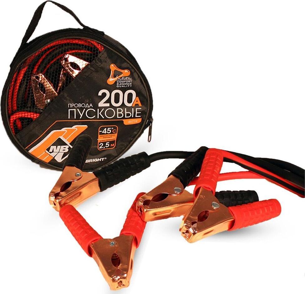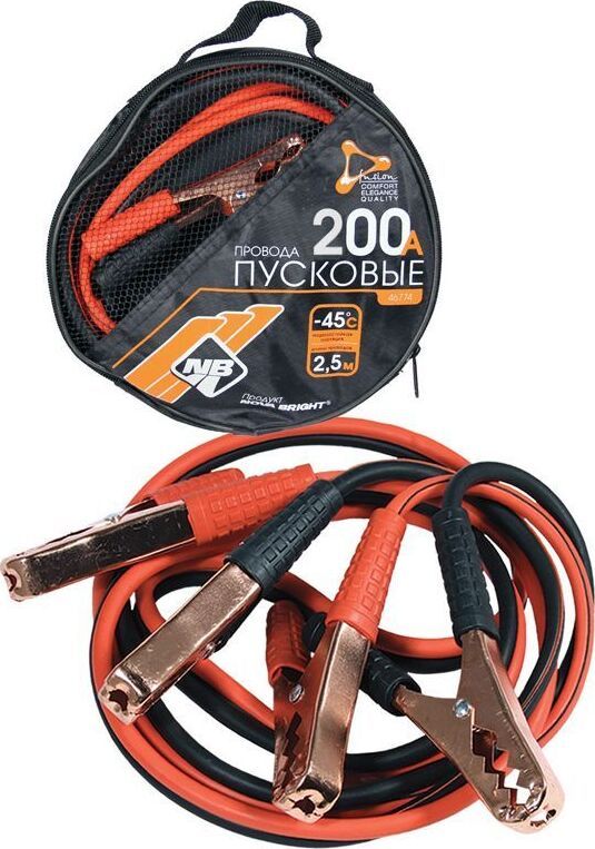 Предназначены для запуска двигателя с разрядившейся аккумуляторной батареей от аккумулятора другого автомобиля. Изолированные ручки зажимов. Сила тока: 200 А. Длина: 2,5 м. Минимальная температура эксплуатации: -45°C Материал жилы провода – медь. В комплекте сумка для хранения.