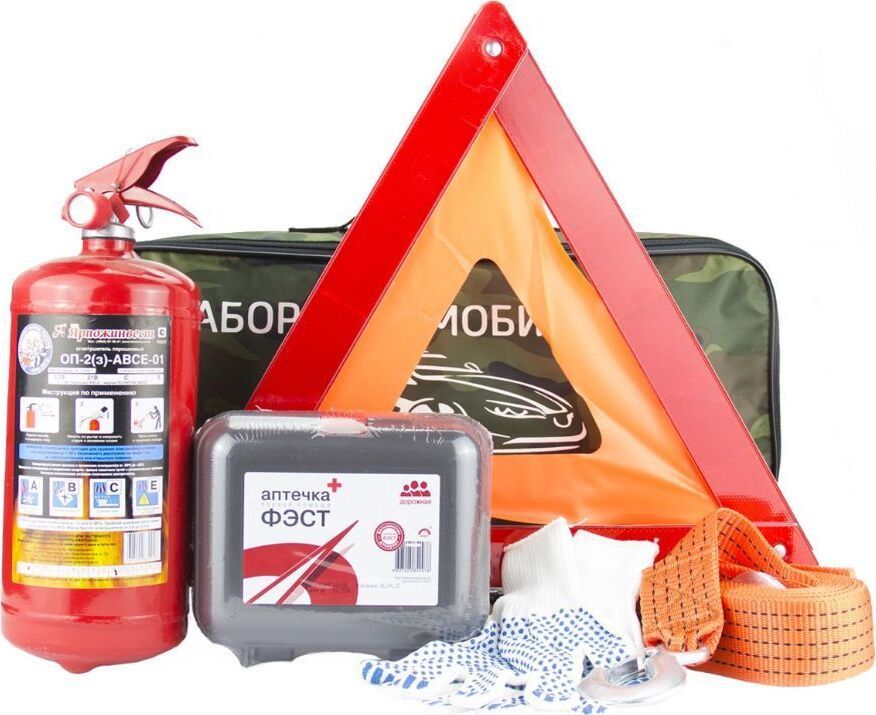 Набор автомобилиста необходим в каждом автомобиле. Содержит компоненты соответствующие Федеральному закону "О техническом осмотре транспортных средств". Предмет первой необходимости в случае ДТП. В комплекте: - огнетушитель порошковый ОП-2; - знак аварийной остановки в футляре; - аптечка; - трос буксировочный из полипропилена 4,8 м/5т; - перчатки х/б с напылением.