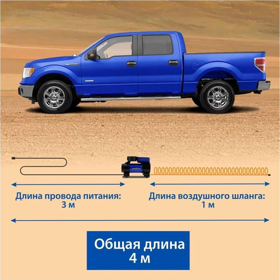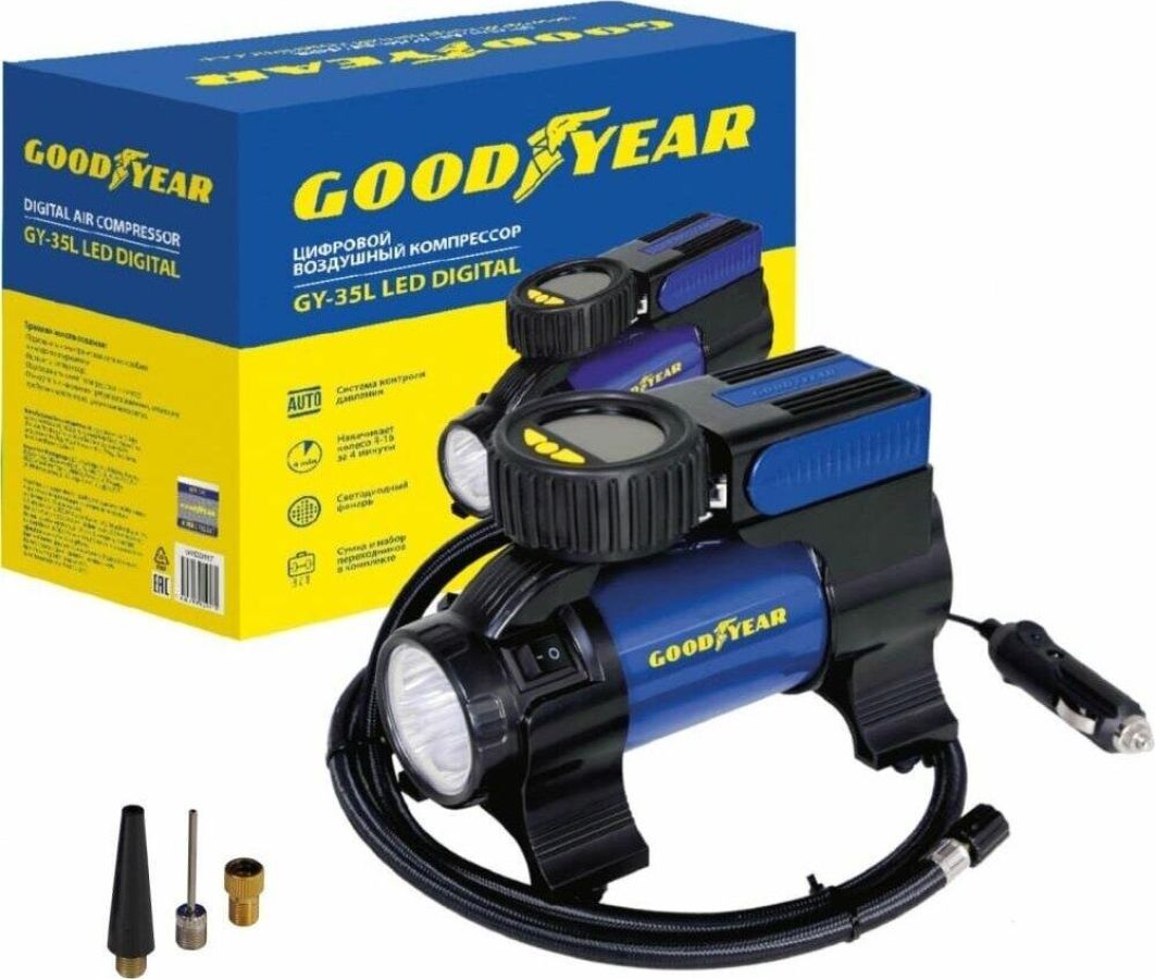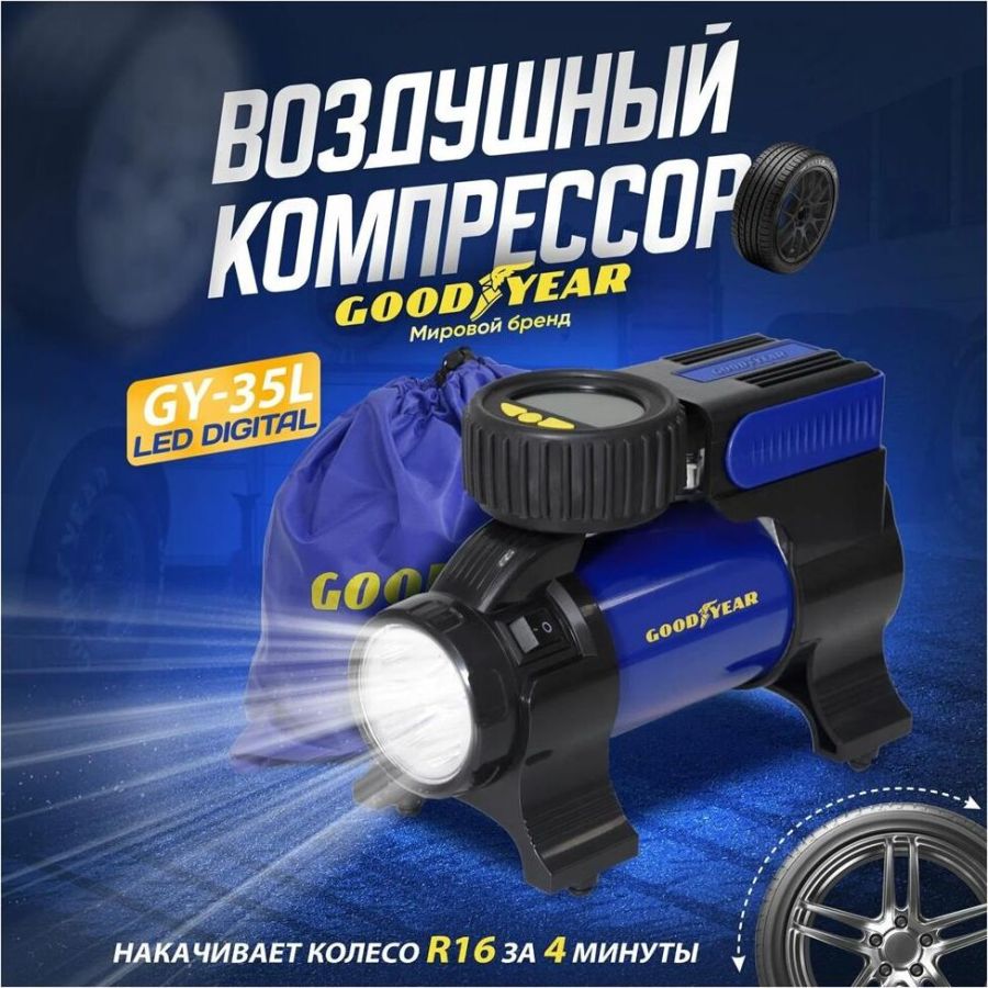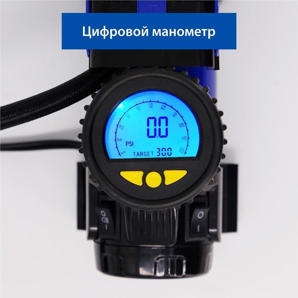 Мощность - 168 Вт, Производительность - 35 л/мин, Максимальное токопотребление - 14 А, Максимальное давление - 7 Атм, Длина провода питания: 3 м, Длина воздушного шланга: 1 м. Сумка и набор переходников в комплекте.