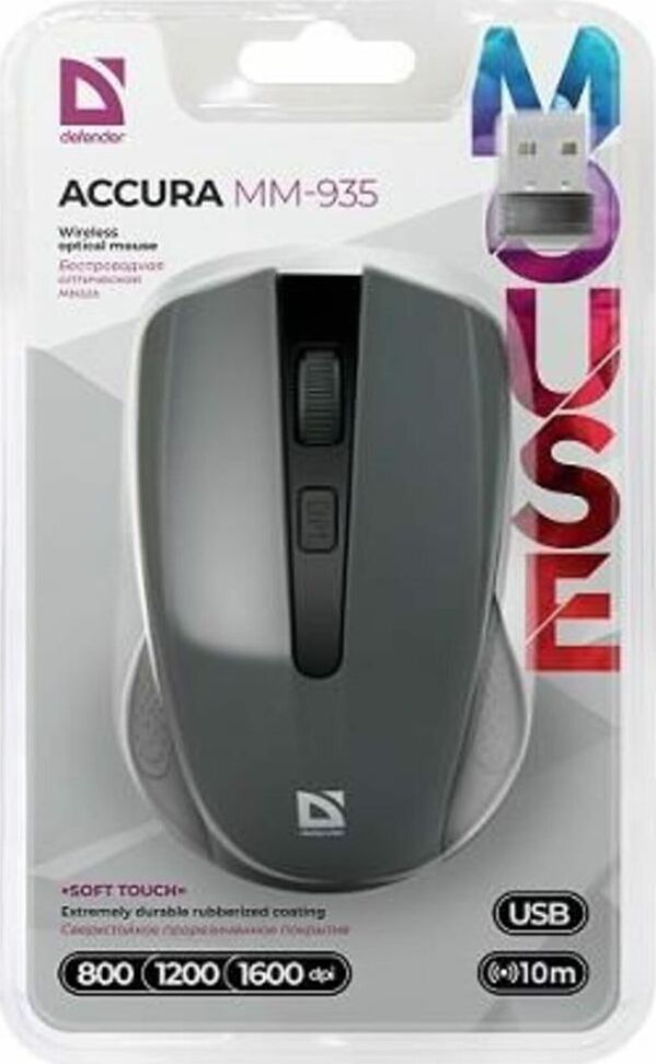 Мышь беспроводная оптическая, интерфейс USB, 4 клавиши+ колесо-кнопка, разрешение сенсора 800/1200/1600 dpi, сверхстойкое прорезиненное покрытие «Soft Touch», приятно на ощупь и предотвращает скольжение, радиус действия - 10 м, цвет: серый