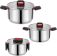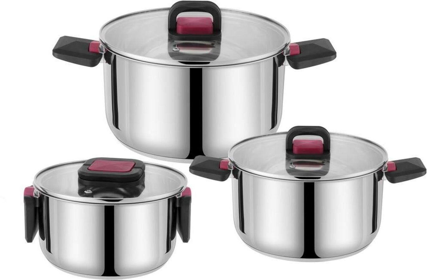 Набор кастрюль 20см, 24см и соусник 16см с крышками. Материал нержавеющая сталь марки 18/10 (AISI 304). Подходит для всех типов нагревательных поверхнойтей. Объем 1,8л, 3,6л, 6,2л.