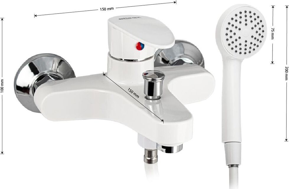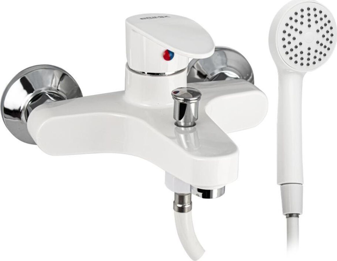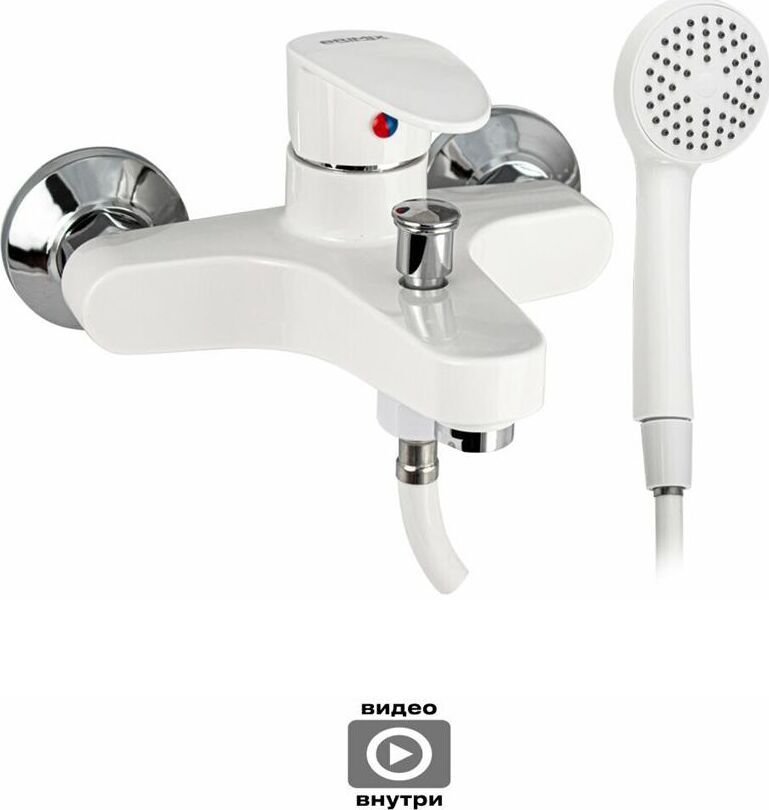 Смеситель из высокопрочного пластика АБС, БЕЛЫЙ в ванную / душевую комнату с коротким изливом, литой корпус, шаровый, с кнопочным дивертором на корпусе. Картридж d = 40 мм, литая ручка, хромированный аэратор для экономии воды, хромированные чашки и эксцентрики. Габаритные размеры: ширина 150 мм, высота корпуса 100 мм, длина излива 150 мм, душевая лейка d = 75 мм, шланг 150 см. Вес - 1,2 кг, объём - 0,00469 м3. В комплекте паспорт, корпус с изливом, дивертор, душевая лейка, шланг, кронштейн, комплект крепежа и прокладок.