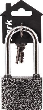 Замок навесной Park ВС3Р63-01 ключевой механизм - латунь 3 ключа в комплекте размер корпуса: 4,3 х 6,3 х 2,5 см размер дужки: d 0.92 х h 8,7 см размер замка: 13,0 х 6,3 х 2,5 см упаковка пластиковый подвес в виде домика и п/э пакет