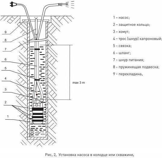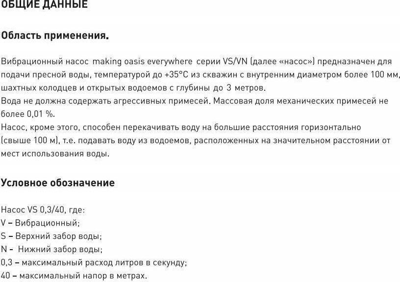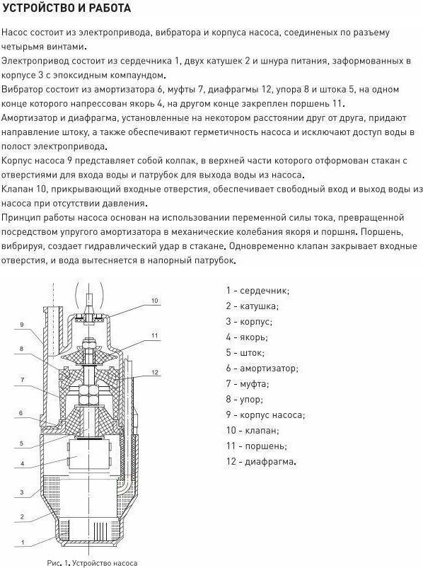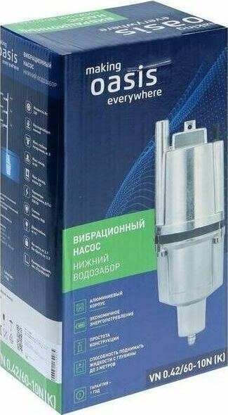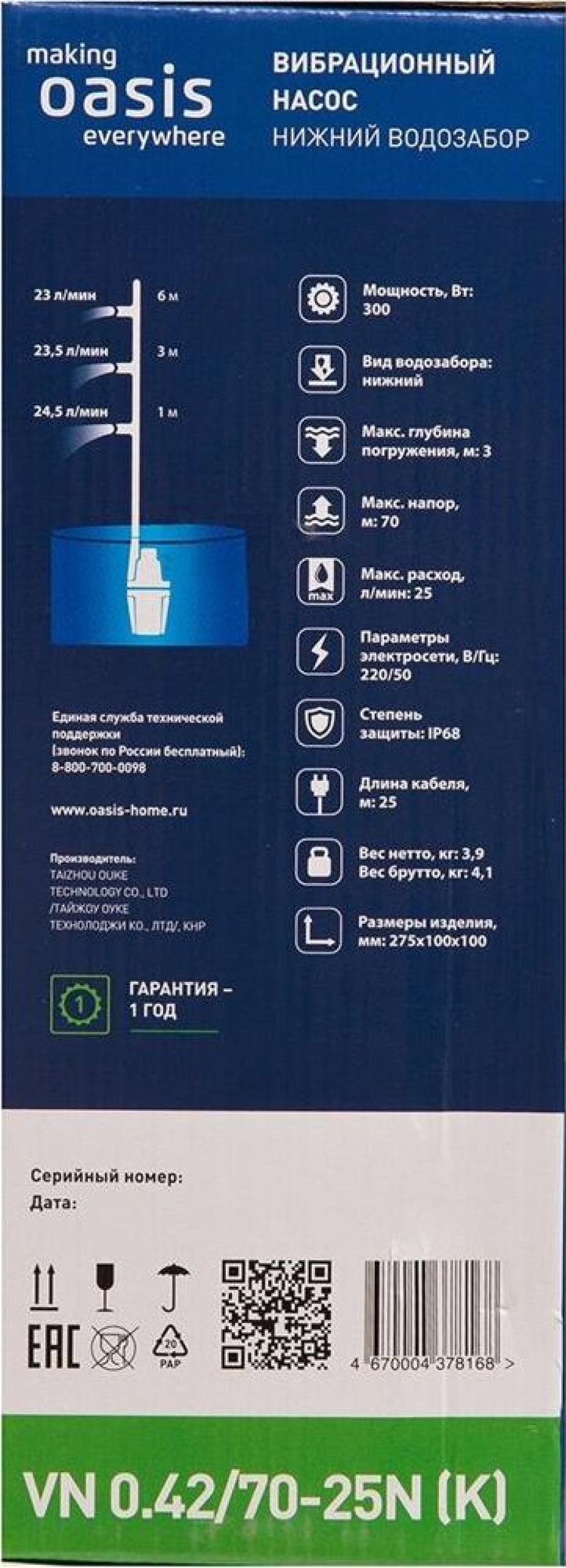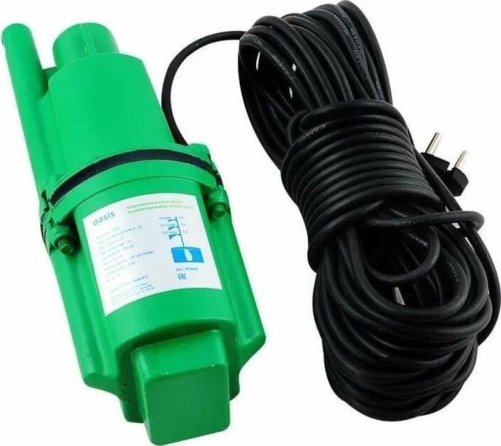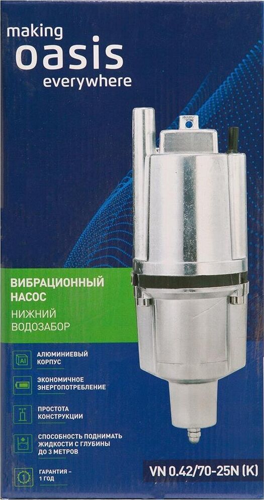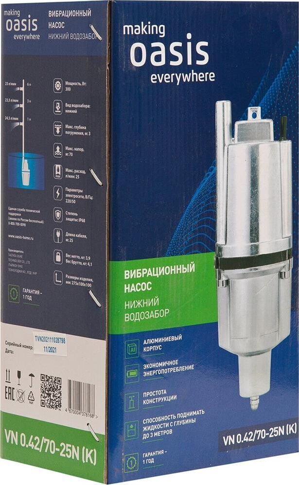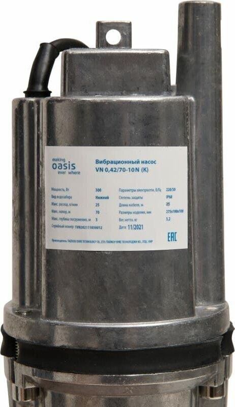 Насос вибрационный, нижний забор воды, мощность 300 Вт, максимальный напор 70 метров, максимальный расход 25 л/мин, длина кабеля 25 метров
