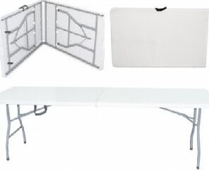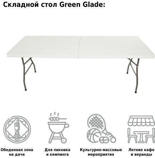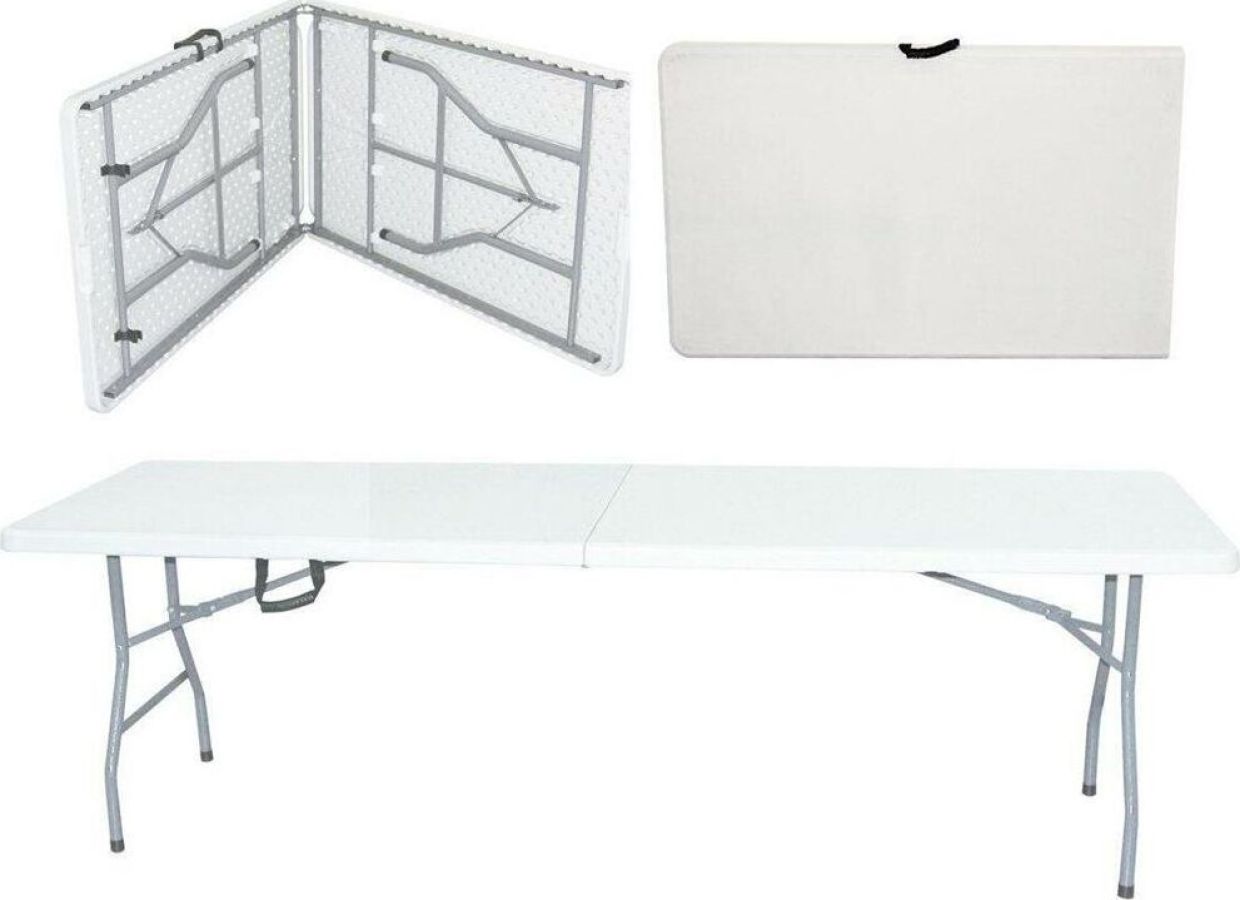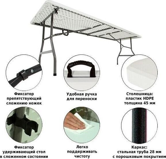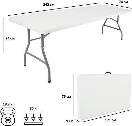 Стол раскладной, выполнен из качественного пластика, каркас - сталь. Складывается в одно движение. В сложенном состоянии очень компактный. В дождь, на зиму или пока вас нет на даче, можно убрать. Стол подойдет как для дачи или сада, так и для помещения. Не боится влаги. Есть возможность фиксации ножек.Размер (дхшхв) 238х75,5х74 см.Материал: пэнд+сталь.Вес нетто/брутто: 21/22 кг.Размер коробки: 121х77х10,5см.