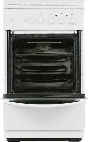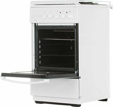 Размеры (ШхГхВ) 50x54х85см, объем духовки 50 л, 4 конфорки, стеклянная крышка, хоз. отсек, комбинированная (верх-3-газ/1-электро), электрическая духовка, профильная решетка, подсветка духового шкафа, электророзжиг стола, еврошарнир