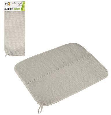 Коврик для сушки посуды из микрофибры С подвесом, возможно сложить пополам Размер: 35х45см Цвет: серый Материал: полиэстер, поролон (3мм толщиной) Упаковка: хедэр Коврик отлично впитывает влагу. Можно использовать непосредственно на столешнице или с