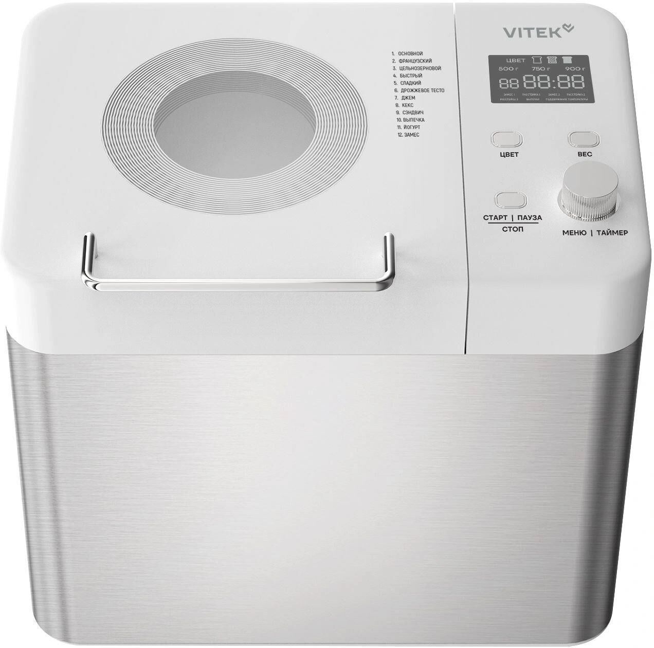 Тип управления кнопочное Мощность 650 Вт Максимальный вес выпечки 900 г Количество размеров выпечки 500/750/900 г Формы выпечки буханка Индикация веса выпечки, включения, времени программы, режима работы, текущей программы, этапов программы Программ приготовления 12 Запас памяти при сбое электропитания 10 мин Материал корпуса металл/пластик Таймер отсрочки старта 13 ч