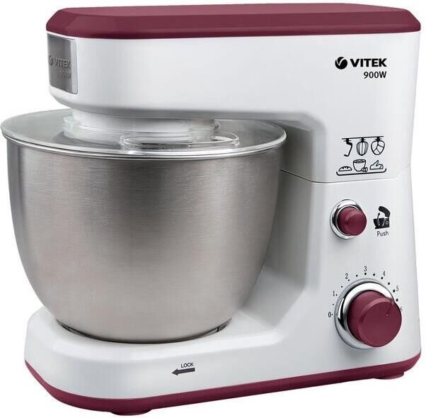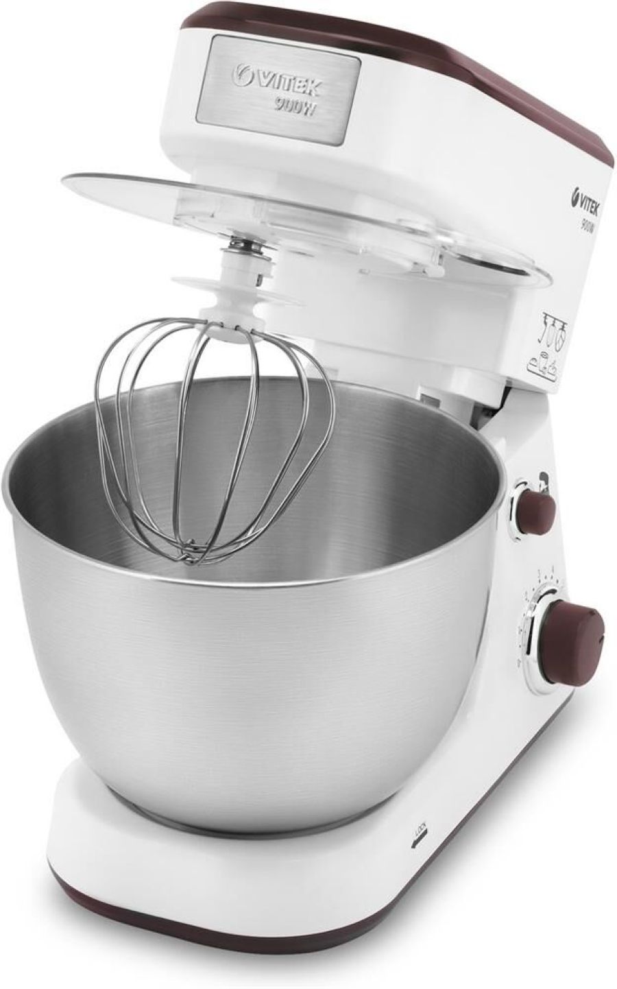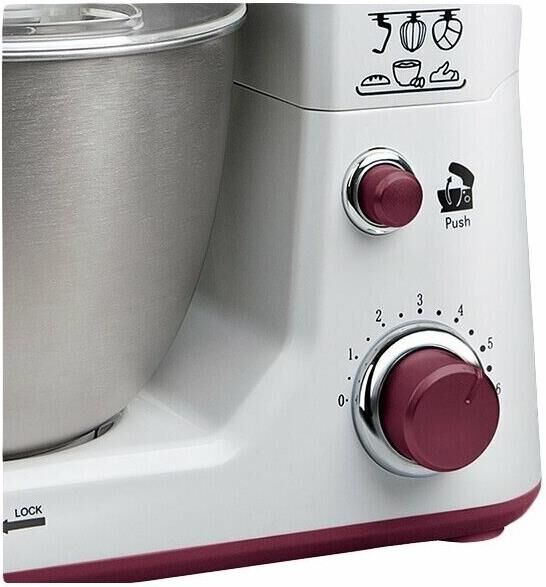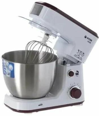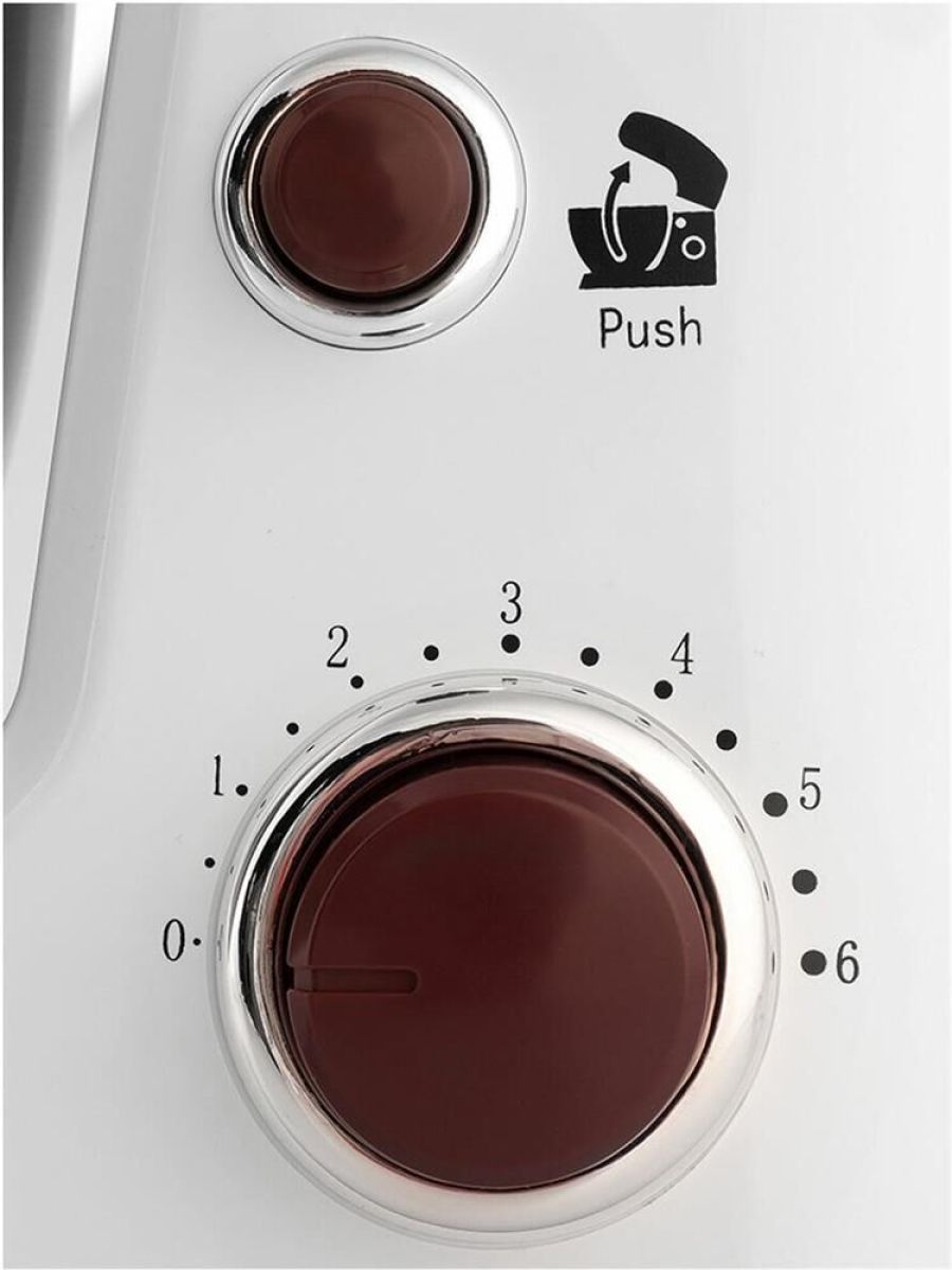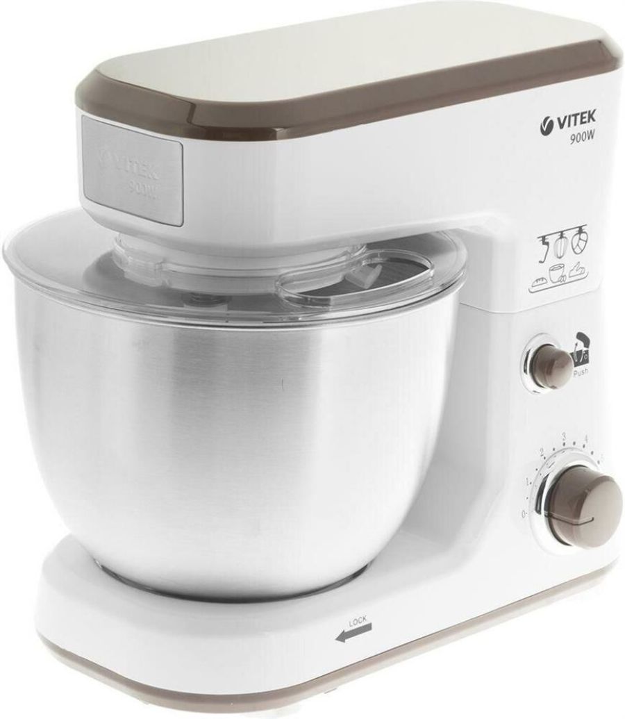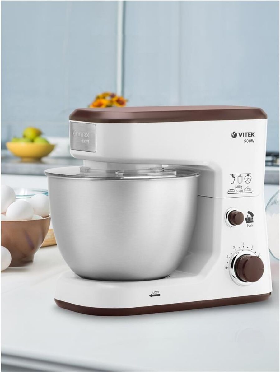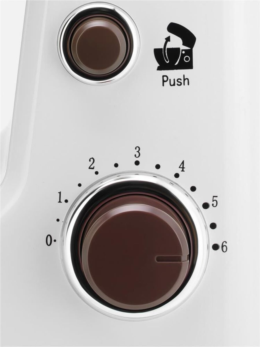 Планетарный миксер. Мощность: 900 вт, Число скоростей: 6, Венчик для взбивания: 1, Крюки для замешивания теста, Количество насадок: 3, Защитная крышка на чашу, Материал чаши: нержавеющая сталь, Объем чаши: 4 литра, Материал корпуса: пластик, Вес: 3,75кг., Длина сетевого шнура: 100 см., Цвет: Белый/коричневый