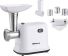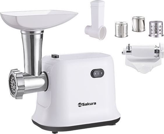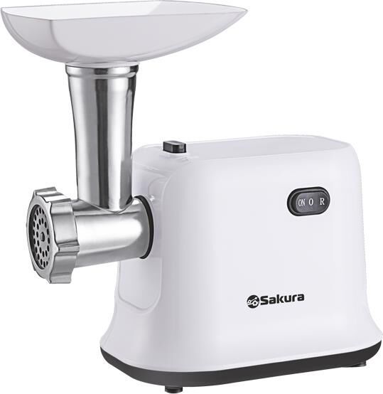 Мясорубка электрическая, 1500 Вт, функция реверс, корпус из эко-пластика, пластиковый лоток для продуктов и толкатель, металл. шнек, нож из нерж.стали, металл диск для измельчения (5 мм), отключение при перегреве.3 насадки-тёрки. соковыжималка для томатов.