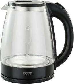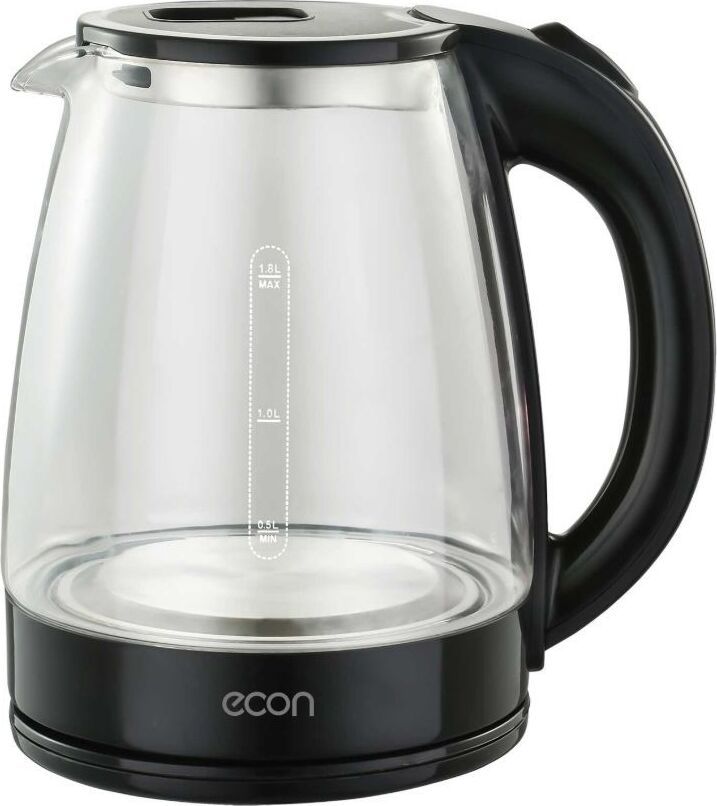 Чайник стеклянный, дисковый нагревательный элемент, емкость 1,8 литра, мощность 1500 Вт, подсветка при включении, автоматическое отключение при закипании, защита от включения без воды, цвет корпуса: черный