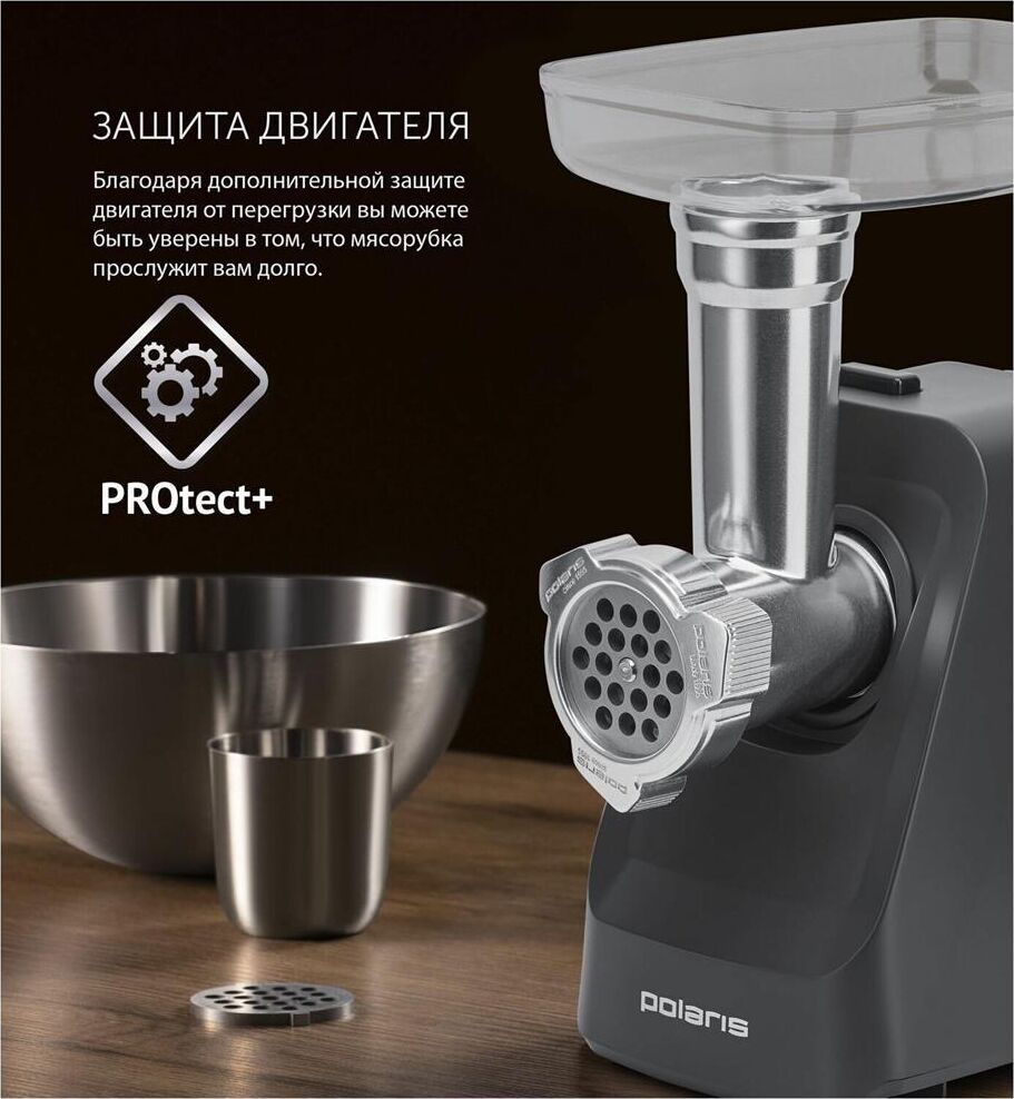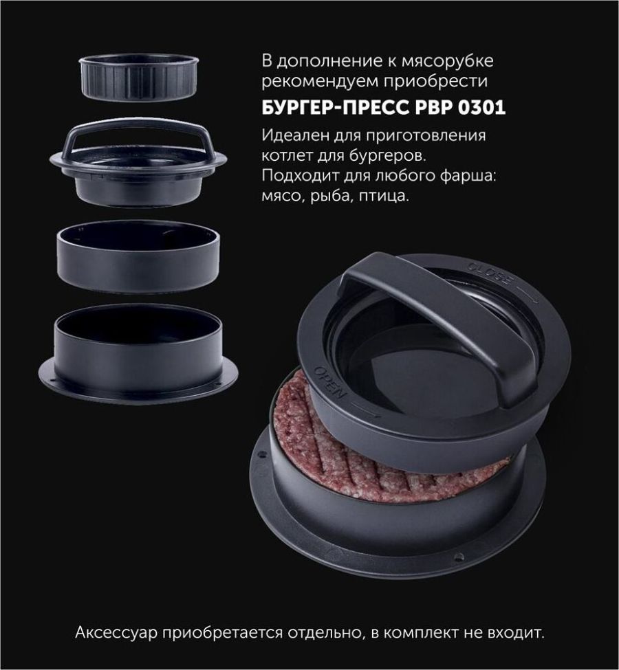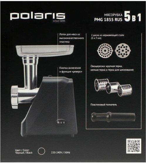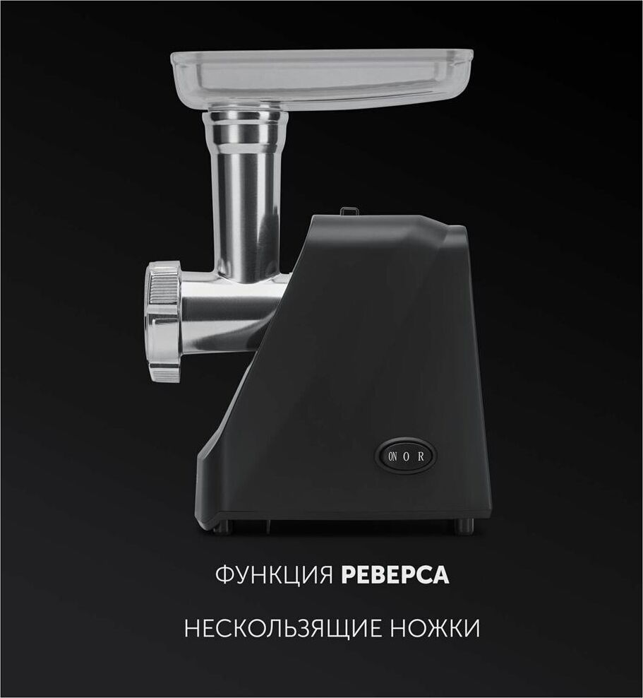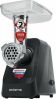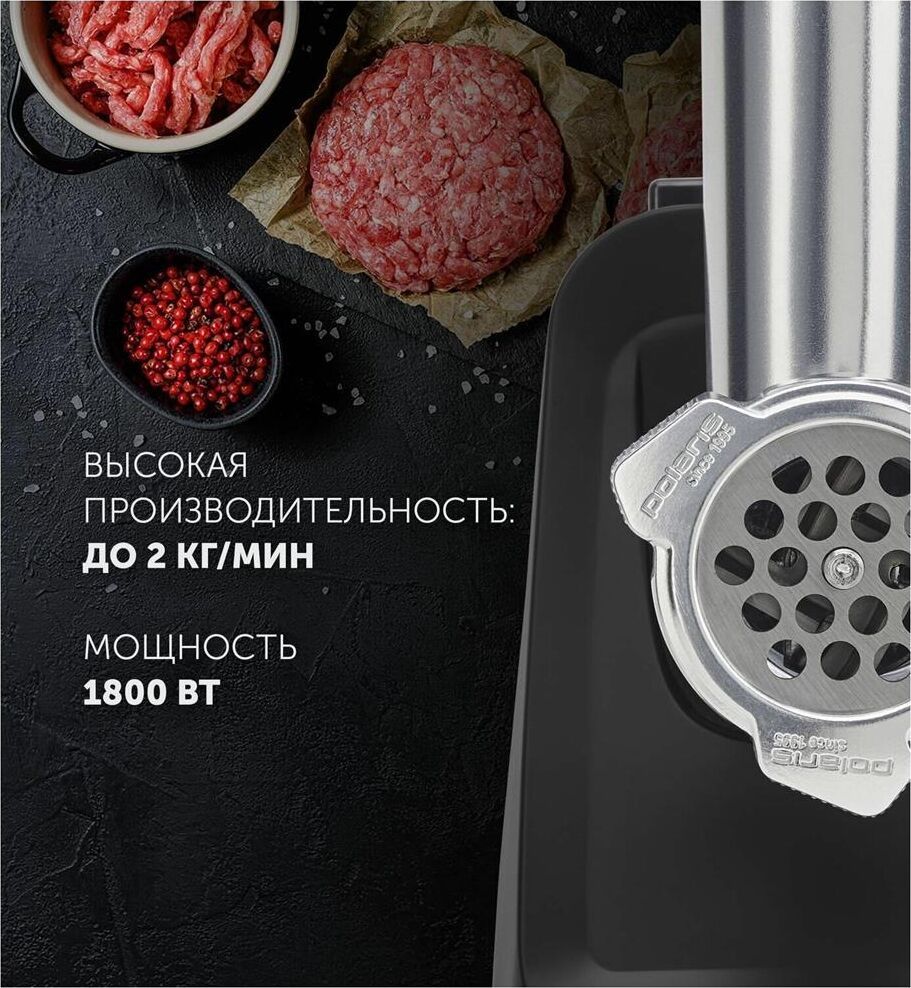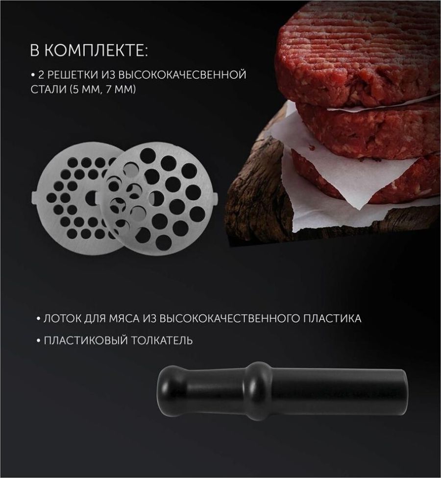 Номинальная мощность, в ваттах: 1800.Высокая производительность: До 2 кг фарша в минуту. Функция реверса. Нескользящие ножки. В комплекте: 2 решетки из высококачесвенной стали (5 мм, 7 мм) Лоток для мяса из высококачественного пластика.Пластиковый толкатель.Овощерезка (3 барабана). Крупная терка. Мелкая терка.Терка для шинкования.