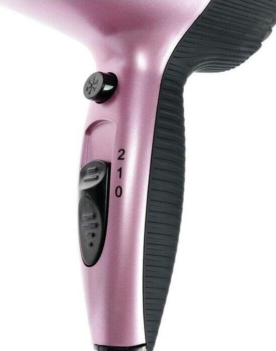 Мощность 2000Вт. 2 режима мощности потока воздуха. Холодный обдув для фиксации прически. Концентратор д/сушки и моделирования. Фильтр воздухозаборника. Петелька д/подвешивания. Прорезиненная ручка.