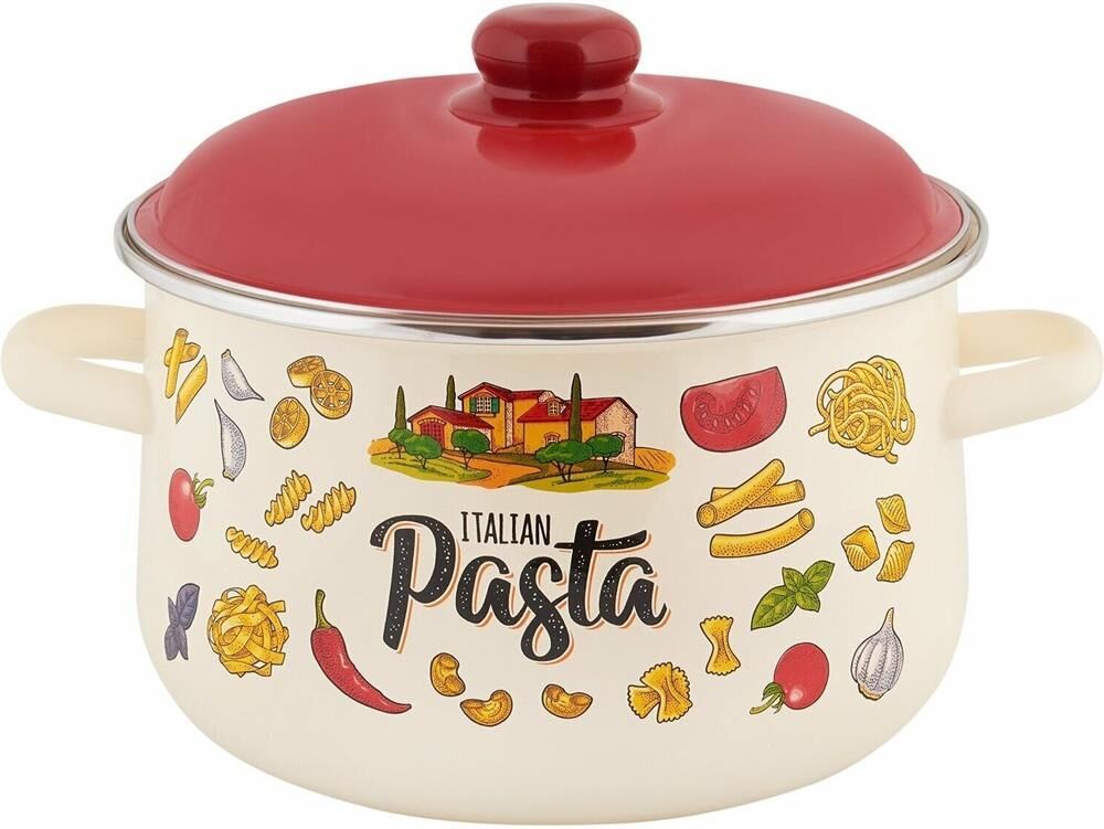Кастрюля эмалированная серия "Pasta ITALIAN" Наружное и внутреннее покрытие - ЭМАЛЬ, стальная эмалированная крышка. Можно использовать в посудомоечной машине. Подходит для всех типов плит, в том числе индукционных. Объем, л./размер, см: 5.5 л Материал: эмалированная сталь Толщина дна: 0.8 Источник тепла: Все виды плит Тип упаковки: коллективная Крышка: эмалированная Внутреннее покрытие: эмаль Внешнее покрытие: эмаль