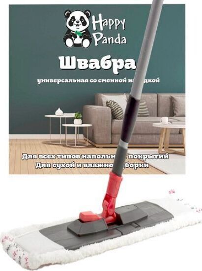Швабра Размеры: длина ручки - 120 см, размер платформы: 43х13 см, тип ручки: телескопическая; вес насадки - 50 гр; материал: пластик, насадка микрофибра. Швабра предназначена для сухой и влажной уборки гладких поверхностей, таких как пол, стены и потолок. Подходит для всех типов напольных покрытий (паркет, ламинат, керамика, линолеум, мрамор). Специально разработанная конструкция швабры помогает распределить давление на всю платформу. Платформа швабры в месте крепления к рукоятке имеет шарнирную конструкцию, благодаря чему швабру можно удерживать под любым углом к полу.