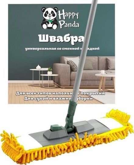 Швабра Размеры: длина ручки - 120 см; размер платформы: 41х12 см, тип ручки: нетелескопическая; материал: пластик, насадка микрофибра "Лапша", вес насадки - 80 гр. Швабра предназначена для сухой и влажной уборки гладких поверхностей, таких как пол, стены и потолок. Подходит для всех типов напольных покрытий (паркет, ламинат, керамика, линолеум, мрамор). Специально разработанная конструкция швабры помогает распределить давление на всю платформу. Платформа швабры в месте крепления к рукоятке имеет шарнирную конструкцию, благодаря чему швабру можно удерживать под любым углом к полу.