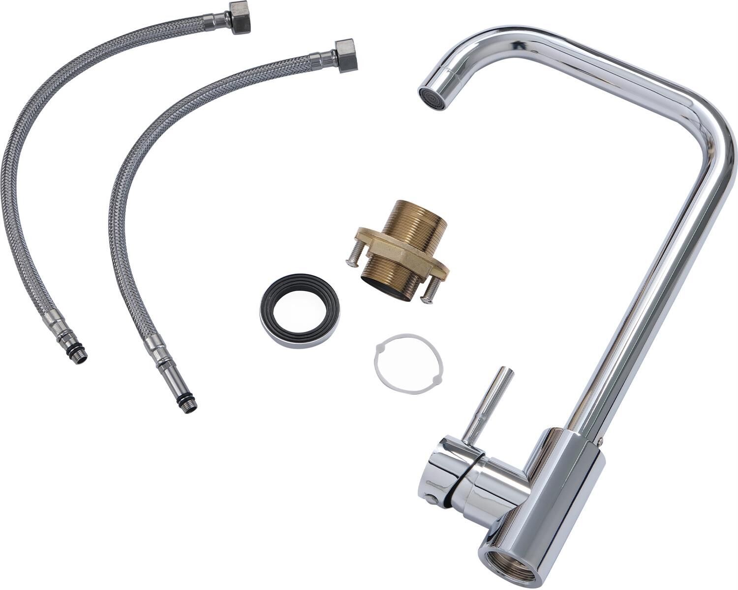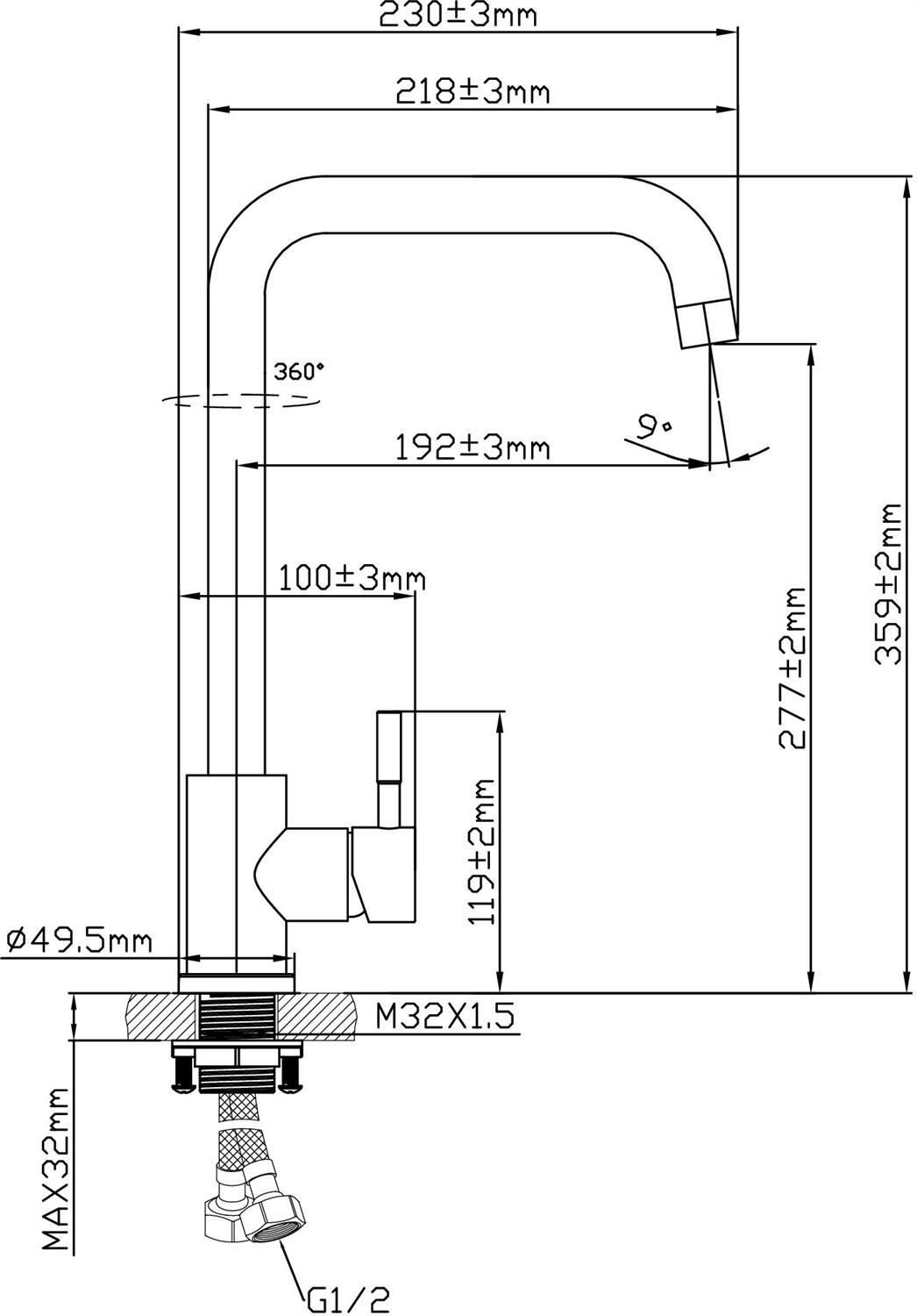 Однорычажный смеситель для кухни. Корпус из нержавеющей стали. Крепление на гайке, присоединительный размер М32х1,5. Лаконичный дизайн Надежные и безопасные материалы Экономный расход воды за счет аэратора Простота монтажа и эксплуатации. Модель SUS1001MG Присоединительный размер М32×1,5 Длина излива, см 27,4 Размеры изделия, см 36х23х10 Материал корпуса Нержавеющая сталь Вес, кг 1,15