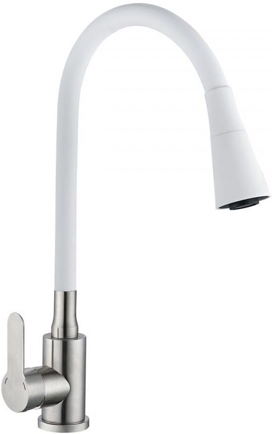 Смеситель для кухни с гибким изливом, серия Садко, АНТЕЙ - Материал: нержавеющая сталь (SUS304) - Вес смесителя: 1,220 кг - Цвет: сатин + белый - Картридж: ø35мм, пластиковая с керамическими пластинами, WANHAI - Излив: поворотный, высокий, гибкий - Аэратор: пластиковый, съемный, 2-х режимный - Крепление: FAST FIX (гайка) из 201 стали В комплекте: гибкая подводка 35см (2шт.), крепление, декоративная подставка под смеситель (1шт.), резиновая прокладка (1шт.), резиновое уплотнительное кольцо (1шт.), пластиковая шайба (1шт.), паспорт смесителя (1 шт.)