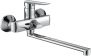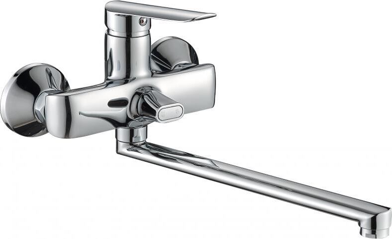 Смеситель для ванны АНТЕЙ®, серия Виадук - Цвет: хром - Картридж: ø 35 мм, с керамическими пластинами - Излив: L-образный, длинный, поворотный, длина – 300 мм - Аэратор: пластиковый, съемный, наруж. резьба Ø24мм В комплекте: лейка для душа (ABS-пластик), шланг 150 см (нержав. сталь), держатель для лейки (ABS-пластик), для монтажа прилагаются эксцентрики, декоративные накладки.