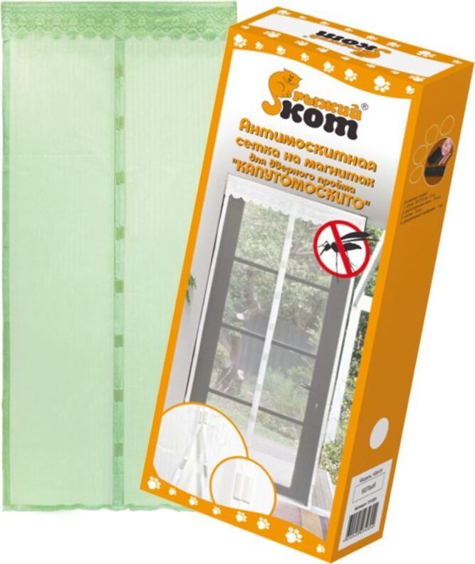 Сетка антимоскитная на магнитах "Капутомоскито". Размеры: 100*210 см. Материал изготовления: полиэстер 100%, плотность 45 гр/кв. метр Цвет: зеленый. В комплект входят: - 2 створки москитной сетки с 9 парами магнитов, - декоративный ламбрекен, - кнопки (10 шт.) , - двусторонний скотч (10 шт.) для крепления к дверному проему Упаковка: цветная коробка.