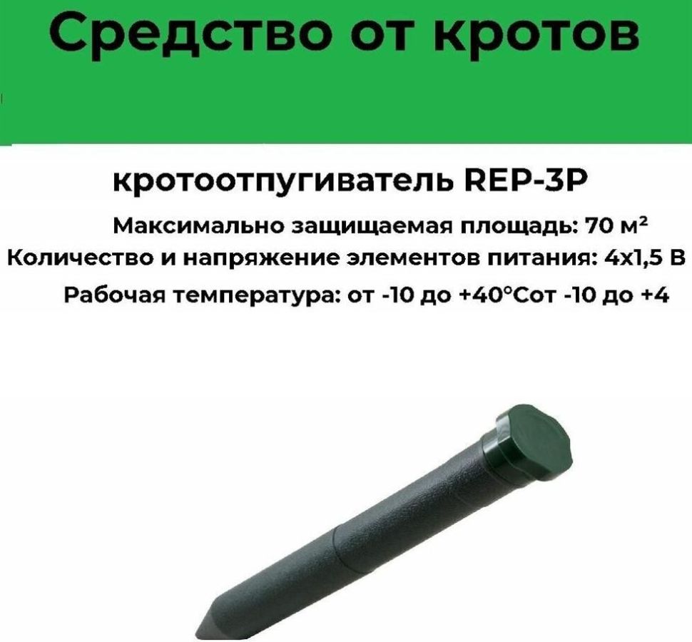 Кротоотпугиватель Rep-3P. Режим работы прерывисто-кратковременный. Батарейки 4 шт. Зона эффективного действия 4-6 соток.