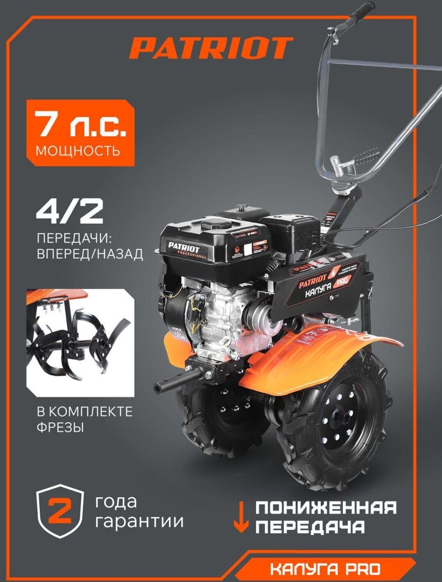 Мотоблок бензиновый PATRIOT КАЛУГА PRO для обработки почвы общей площадью до 1 Га (100 соток). Позволяет без затруднений пахать землю, простаивающую 1-2 года. Может справиться со вспашкой легкой и средней почвы (с плугом), посадкой и уборкой корнеплодов, перевозкой небольших грузов. Высокая мощность Двигатель профессионального класса PATRIOT XP 708 BH с увеличенным ресурсом. Мощность 7 л.с. обеспечивает эффективную работу на участках до 1 Га. Эффективная работа с навесным оборудованием Кронштейн для крепления и шкив для подключения активного навесного оборудования и переключения на пониженную скорость. Большую гибкость в управлении обеспечивают 4 передачи вперед и 2 назад. Цельнолитой редуктор из алюминия Обладает высокой надежностью и не деформируется со временем. Бронированная стальная рубашка и ребра жесткости защищают корпус редуктора от повреждений. Широкий диапазон вспашки Усиленный сошник обеспечивает выбор нужной глубины культивации на фрезах. Ширина вспашки 90 см и глубина от 16 до 30 см позволяют обрабатывать различные типы почв. Надежные фрезы в комплекте Изготовлены из высокопрочной закаленной рессорной стали для эффективного рыхления почвы и повышенной износостойкости при работе с различными типами грунтов. Защита от неполадок Автоматический прерыватель с датчиком масла предотвращает работу без масла. Двухсоставной фильтрующий элемент очищает воздух от мельчайших частиц пыли. Увеличенное оребрение цилиндра и головки блока улучшает теплоотвод. Удобство управлени…