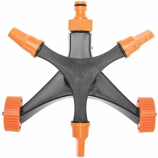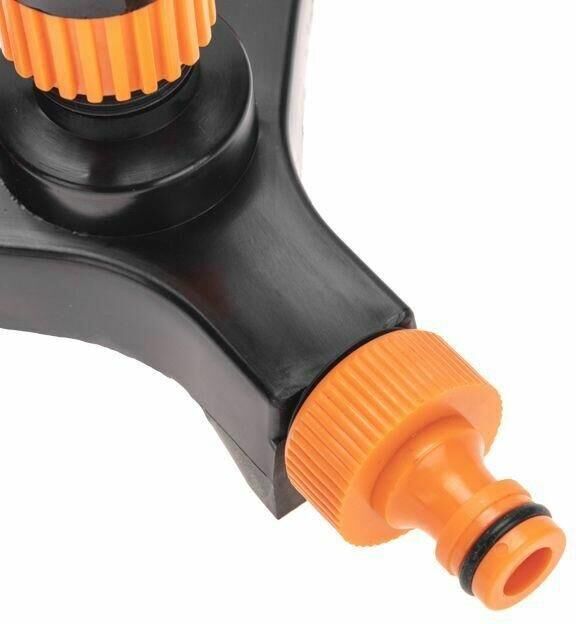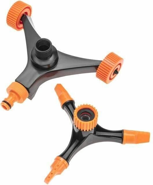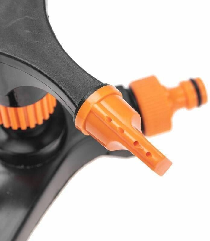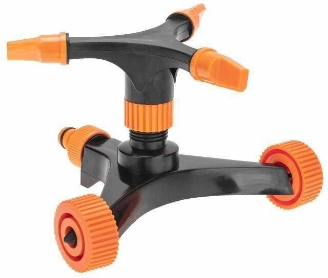 Дождеватель предназначен для полива растений и почвы. Оснащен тремя распыляющими головками, которые раскручиваются под напором воды и обеспечивают равномерный полив поверхности по кругу. Колеса, установленные на основании дождевателя, делают его мобильным, что позволяет быстро и удобно менять местоположение изделия для полива разных участков сада. Надежное и герметичное крепление шланга к дождевателю осуществляется при помощи универсального соединителя, расположенного на корпусе устройства. Дождеватель изготовлен из качественного и прочного пластика, устойчивого к воздействию внешних факторов.