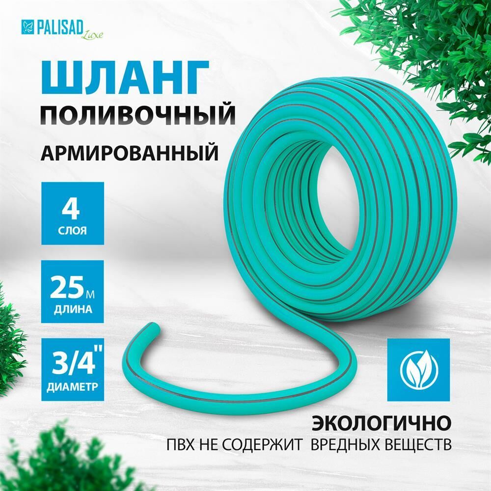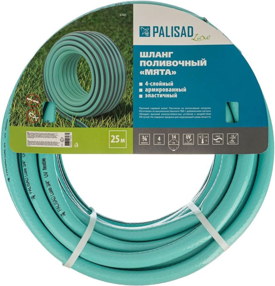 4-слойный армированный поливочный шланг Palisad LUXE Мята 67665 длиной 25 м и диаметром 3/4"" предназначен для повседневного использования. Пригодится дачникам для орошения сада, огорода или газона. Шланг подходит для всех поливочных систем Palisad и Palisad LUXE.ПреимуществаПрочность — шланг выполнен из высококачественного поливинилхлорида (ПВХ) и армирован полиэстерной нитью.Долговечность — инновационная армирующая нить со специально подобранными параметрами угла наклона и шага равномерно распределяет нагрузку на шланг.Защита от разрушения — покрытие Soft Touch предохраняет изделие от мелких повреждений и воздействия УФ-лучей.Эластичность — шланг легко принимает исходную форму после изгибающих нагрузок.Экологичность — ПВХ не выделяет опасных веществ, поэтому безвреден для окружающей среды.